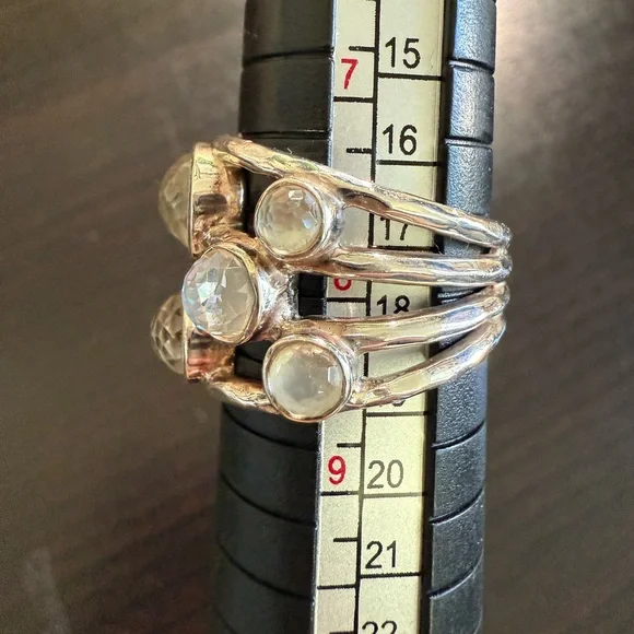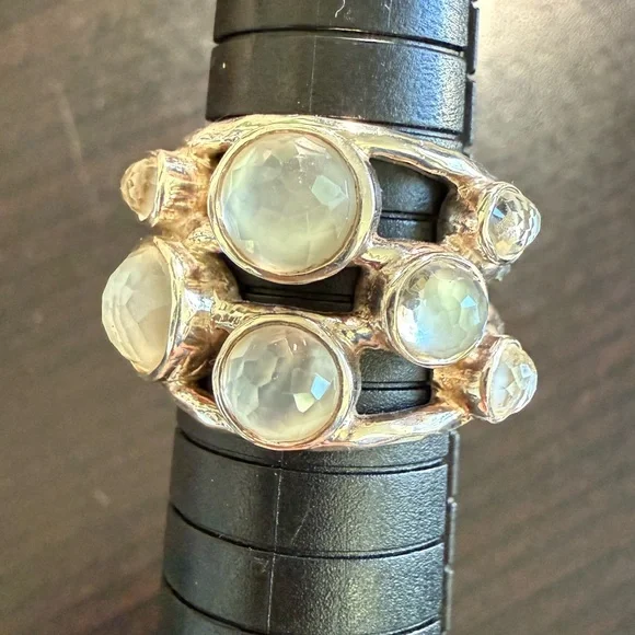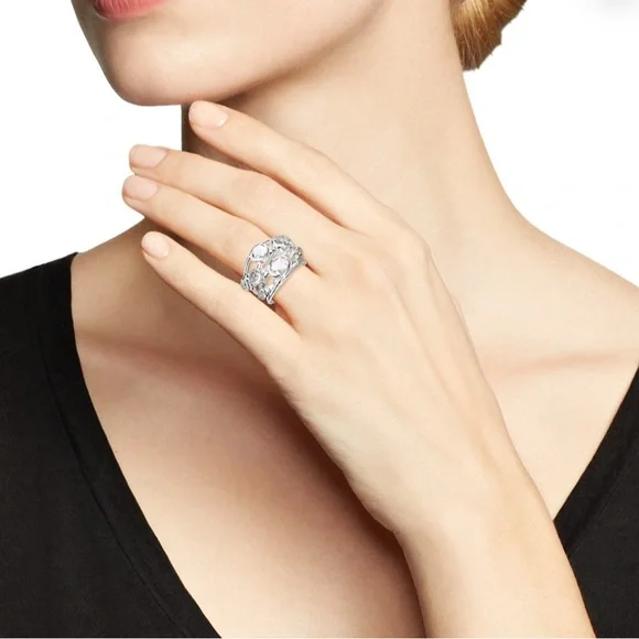 Sterling silver/clear quartzSterling silver and a cluster of clear quartz are the stars of this edgy constellation ring from Ippolita.•Almost all gemstones and black diamonds have been treated to enhance their beauty and require special care.