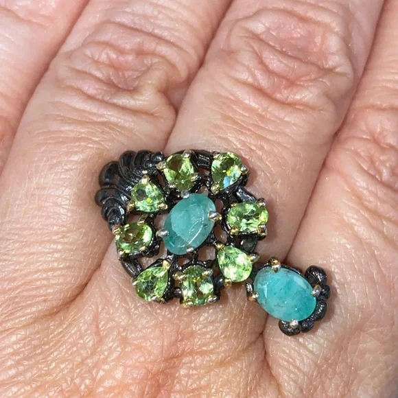 Unique high quality artistic jewelry. 925 sterling silver, rhodium and 14 K gold overlay ring, accented with genuine Emerald(unheated) and genuine faceted Peridot.Gorgeous ring,...