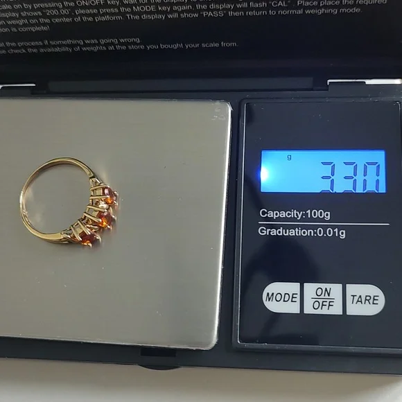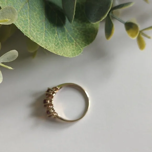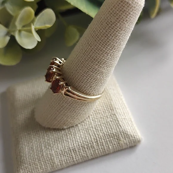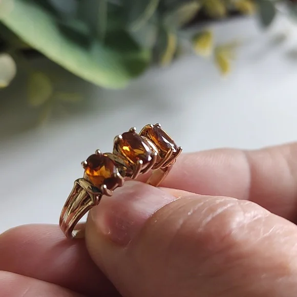 This pretty butterscotch colored stone is from the Citrine family. It´s done in a past, present, future motif. The stones are prong set carved band. It´s solid 10k gold...