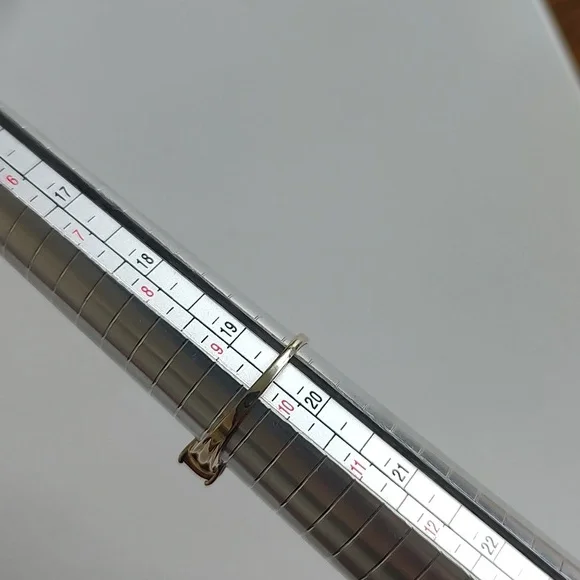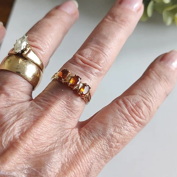 This pretty butterscotch colored stone is from the Citrine family. It´s done in a past, present, future motif. The stones are prong set carved band. It´s solid 10k gold stamped. It has a little bit of weight in gold. It´s a size 9.78. Nearly size 10.