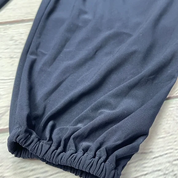 Women´s Kulture Rectangle Jog jumpsuit in Midnight Blue by Norma Kamali Pull on, easy fitShort sleeveLow cut slit necklineCuffed ankleWrinkle free stretchy fabric94% Polyester, 6% SpandexMachine WashSize XSApproximate measurements in the photosExcellent conditionThis luxurious stretch jersey one piece has wide, abbreviated kimono sleeves and a relaxed, open slit front neckline. The lightly pleated pants glide over hips into an easy-fitting cropped leg.B2-2