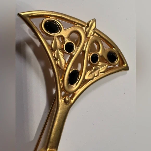 This Vintage Fan brooch from Karl Lagerfeld Couture is gorgeously crafted with 24kt matte gold plating and Swarovski jet stones. See my closet for matching earrings!Still beautiful after all these years, which is testimony to the quality of craftsmanship in Providence RI jewelry makers in the late 20th century.Lagerfeld was not only head of his own couture house, but also for , Fendi, Chloe and more.Happy to send more info and photos.