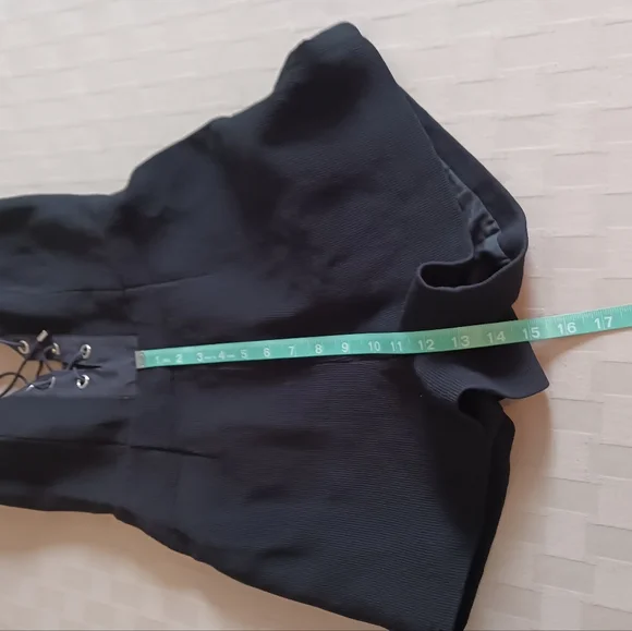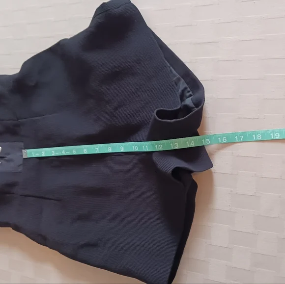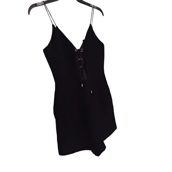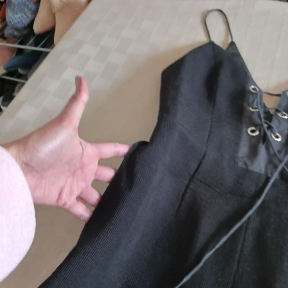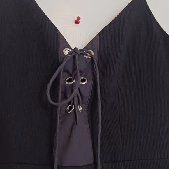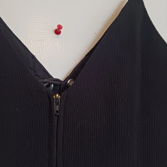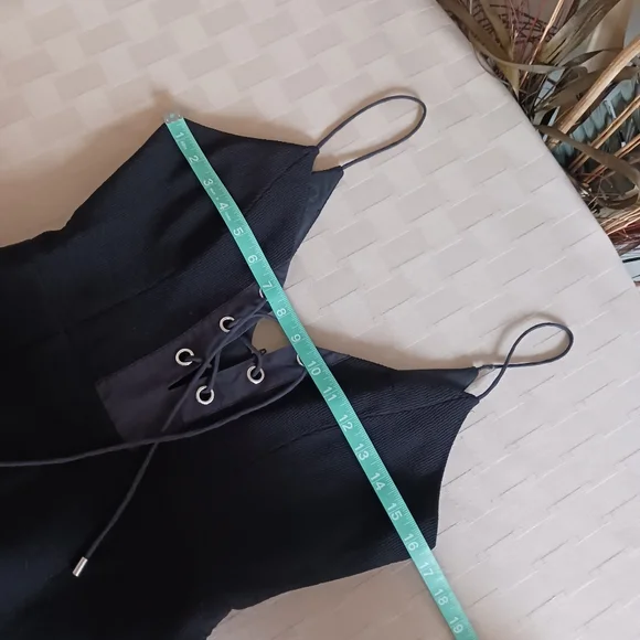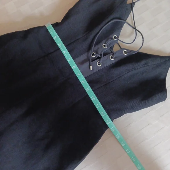 measurements and fabric comps in pictures v neck with lace up front detailing, cami shoulder straps,side slip on pockets, zipper at back, linedin excellent pre-owned condition