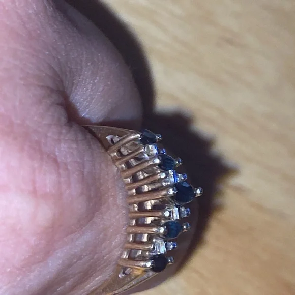 Solid 10 karat yellow gold marked and tested. Natural diamonds and sapphire thoroughly tested. We are licensed, professional jewelry dealer and appraisers. Buy with confidence… we photograph and video record all of our shipping, handling and all our incoming packages. Please se pictures asked any questions. We have no wiggle room to negotiate on this item, our price is firm.Thanks for looking!