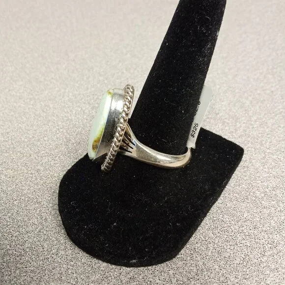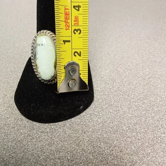 This sterling silver ring showcases a handcrafted Navajo design by Allen Lee, featuring an elegant oval green stone centerpiece. Its size 8 fit and intricate rope detailing make...