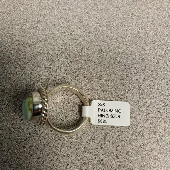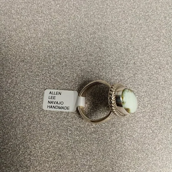 This sterling silver ring showcases a handcrafted Navajo design by Allen Lee, featuring an elegant oval green stone centerpiece. Its size 8 fit and intricate rope detailing make it a distinguished accessory for refined tastes. Ideal for admirers of artisan jewelry and Navajo craftsmanship.Navajo Jewelry artists inform that the light color of this stone is referred to as "Dry Creek" or "Palomino" Turquoise• Handmade by Navajo artisan Allen Lee• Sterling silver with polished finish• Oval green stone centerpiece• Intricate rope detailing around the stone• Size 8 fit for comfortable wear