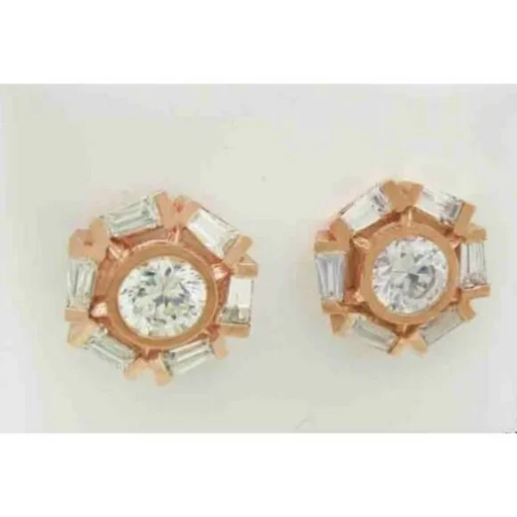 Karat : 10K Rose GoldGemstones : 2 created White Sapphire - 0.75 ct each12 created Round White Sapphires Total ct weight : 2.90 caratsWhite sapphire grades,Hue . . . whiteSaturation . . . vividNo inclusions or flawsType of Setting : Bezel & ChannelShape of Stone : Round & BaguetteDimensions : 12 mm (0.47") each earring measurementsPush Back (pierced)