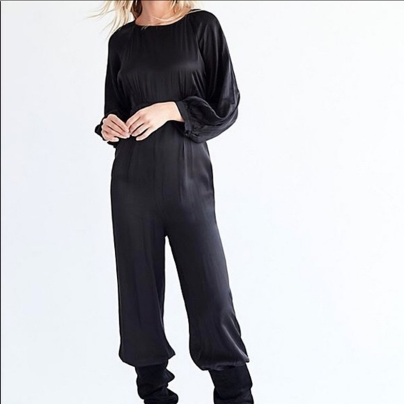 NWT Free People Ordinary Magic satin jumpsuitSuper silky jumpsuit featuring lace inserts throughout in a scoop-neck silhouette with long sleeves and tie at back. Dramatic sleeves Hidden side zip closure Tapered legs Color: black*** I have the same jumpsuit in pink (sizes 0 & 2). Please see my other listing if interestedNew with tagsB29