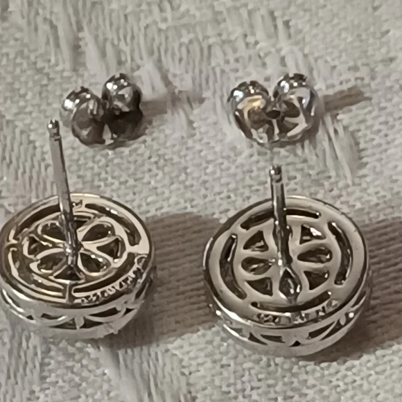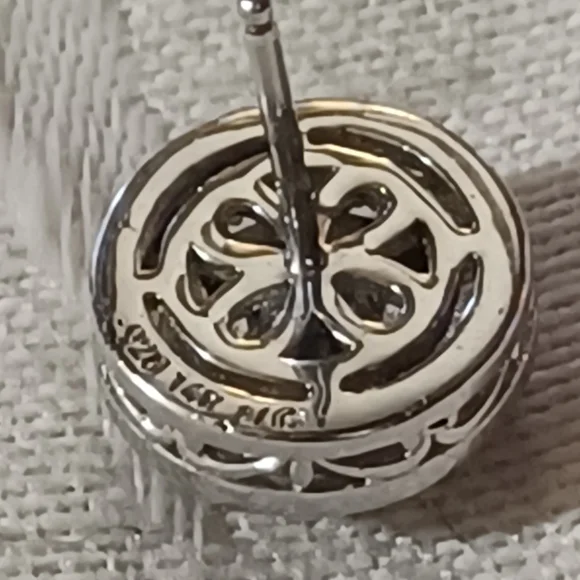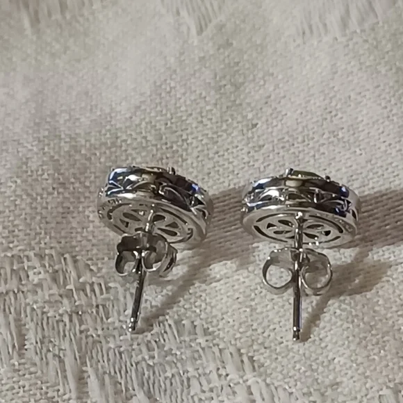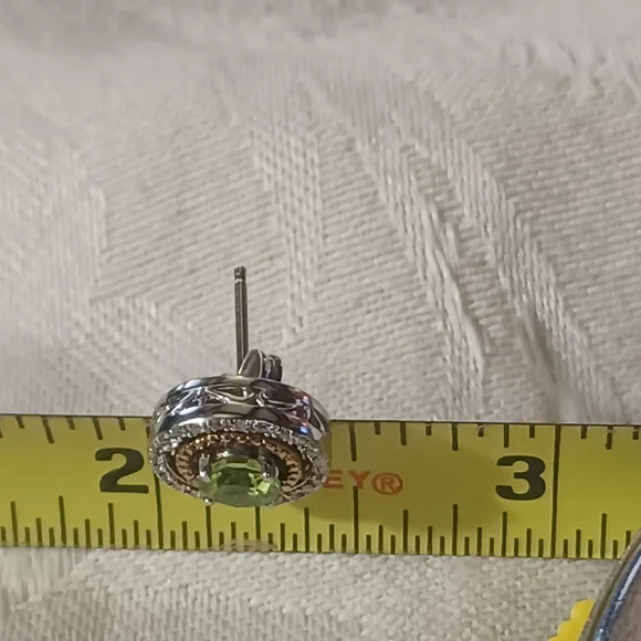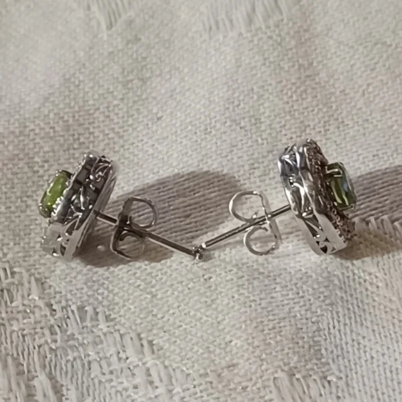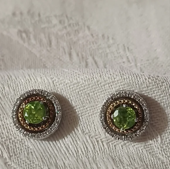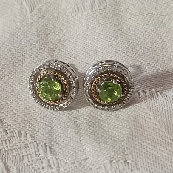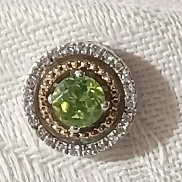 Lovely Alwand Vahan Peridot and Diamond halo earrings are a beautiful pair to wear every day. A peridot is prong set in the center and is surrounded by 14k yellow gold beaded details, and then there is a diamond Halo on the outside. I am unsure of diamond and peridot carat weight. These are in Sterling Silver. Each earring is stamped on the back 925, 14k, and AV. The butterfly backs are each stamped 925. These are in excellent pre-owned condition.
