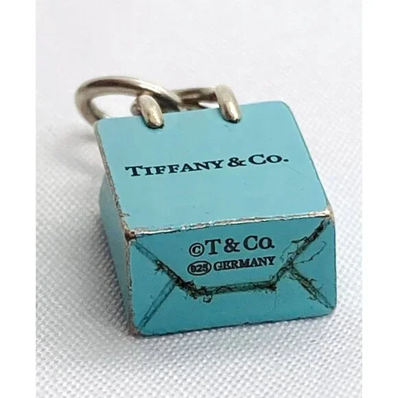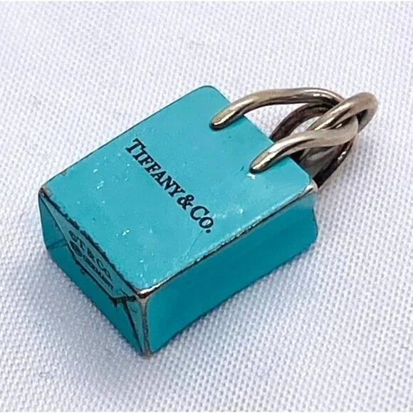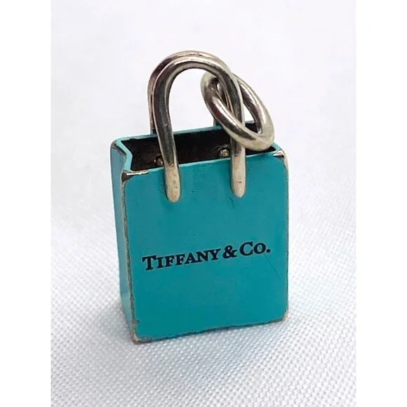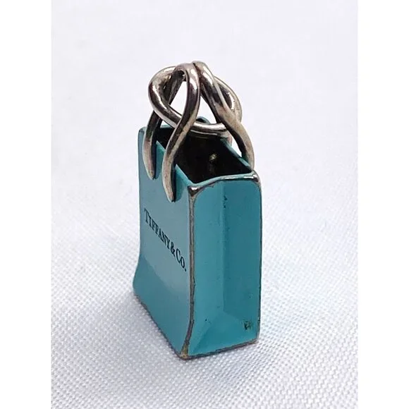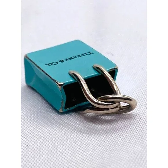 Tiffany & Co Sterling Silver Blue Enamel Shopping Bag Charm Pendant.Shows Light Wear on edgesand on bottom3.4 Grams Please see all pictures to determine condition.Hallmarked T & Co 925 Germany