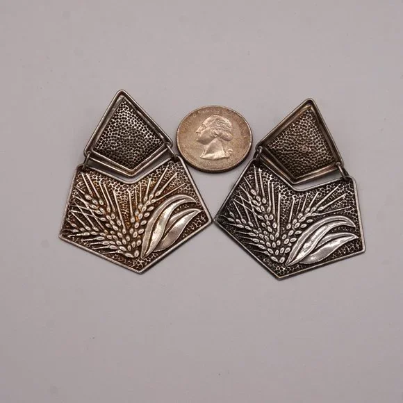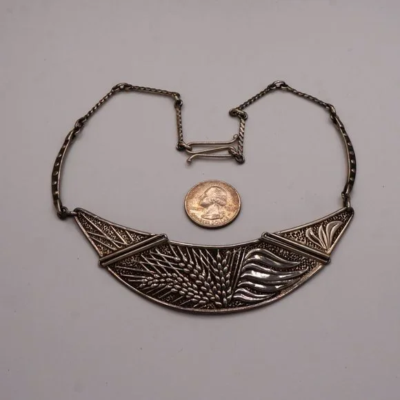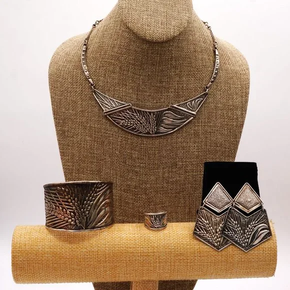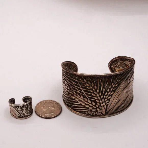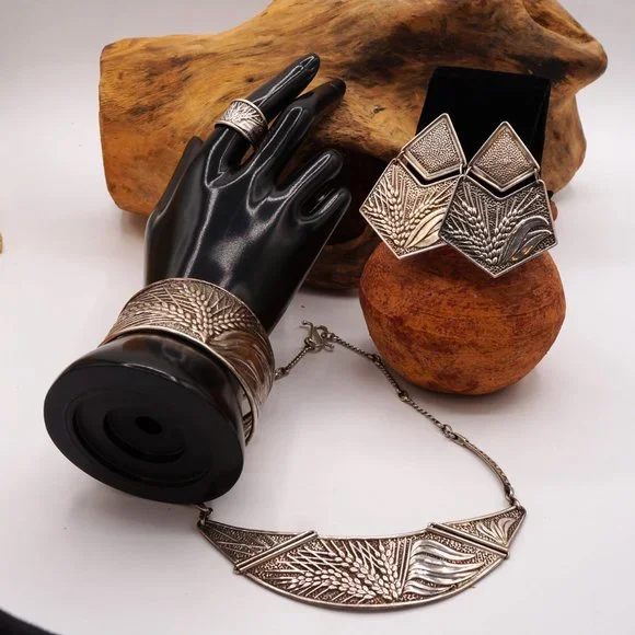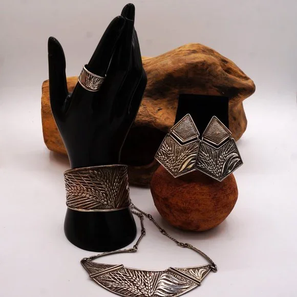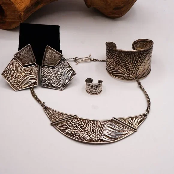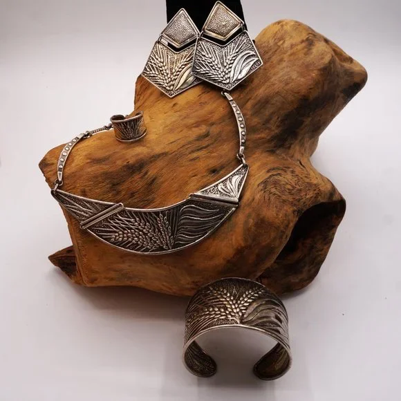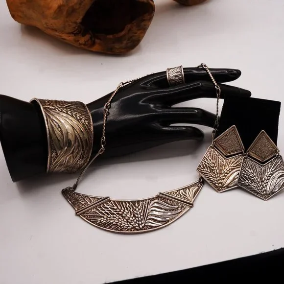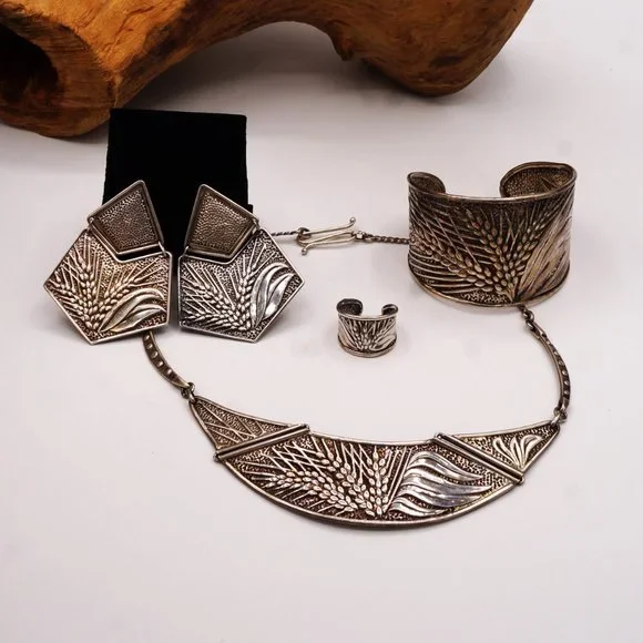 Add a touch of elegance and beauty to your jewelry collection with this unique Italian vintage silver jewelry set of 4:Wheat Bib Choker; 17 inchesWheat wide Cuff bracelet; 6 Inch round 1 inch opening, adjustable to a little bigger or smallerWheat wide Drop Earrings, 59.80 mm x 45.46 mm and weight is 13.01 grams Wheat wide Ring; Size 7.5 with 6.91 mm opening, adjustable to smallerThe set is hallmarked 925 silver and features an unidentified signature mark brand. The jewelry pieces have a classy bohemian and artistic design, inspired by nature, signs, symbols, flowers, and plants, making them an excellent gift choice for special occasions such as Mother´s Day, Christmas, graduation, anniversary, birthday, or Valentine´s Day. ring size is 7.5 adjustable. The set was made in Italy, and it reflects the country´s high-quality craftsmanship skill. Excellent vintage condition with oxidation and patina and ready to wear.Bracelet width:43.15 mmNecklace Pendant Bib measures:4.75" x 1"Ring width:15.12 mmTotal weight:77.18 grams