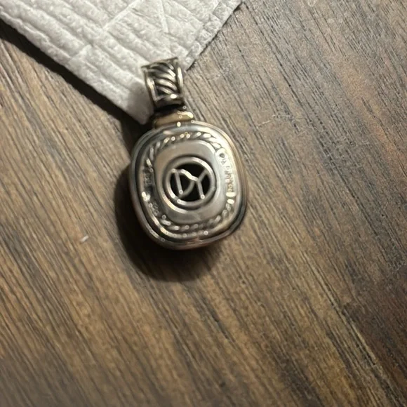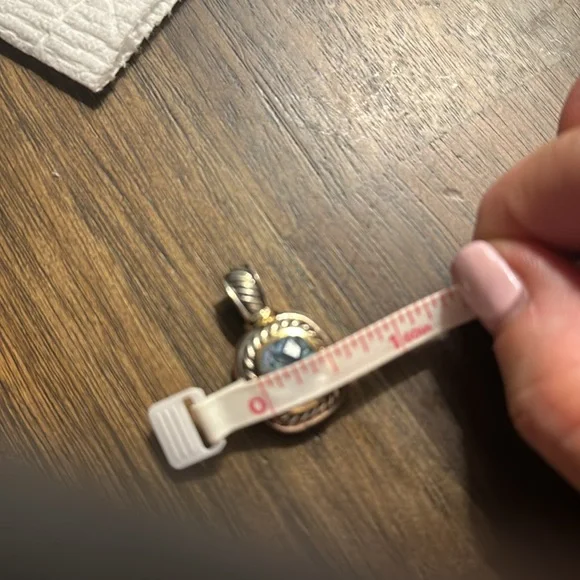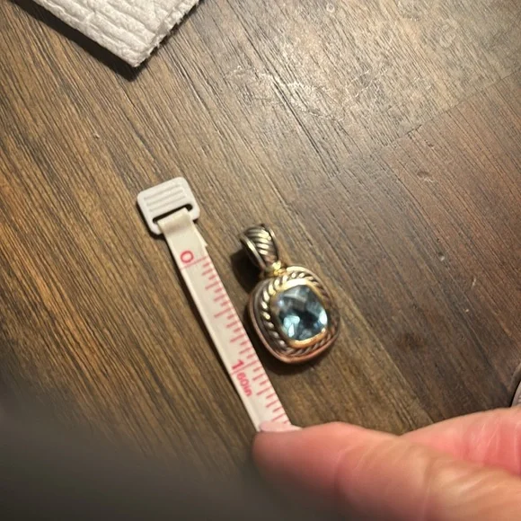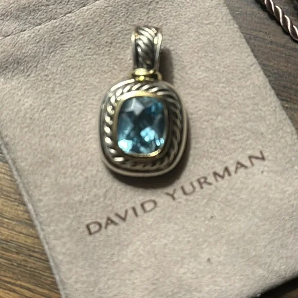 David Yurman blue topaz pendant, I had the enhancer soldered closed,it doesn’t open but fits in thick chains. Great condition. Sterling silver and The bezel is 14k.