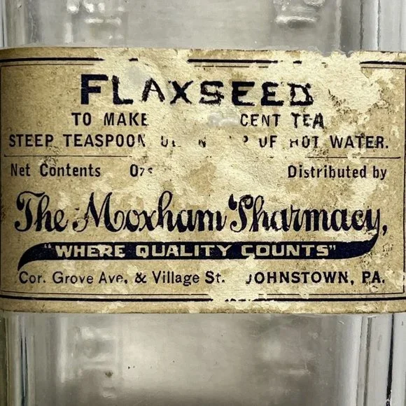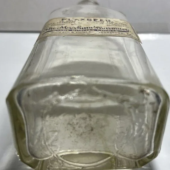 7 1/4” Antique Medicine Bottle Moxham Pharmacy Johnstown PA Flaxseed W Label!