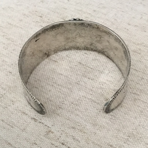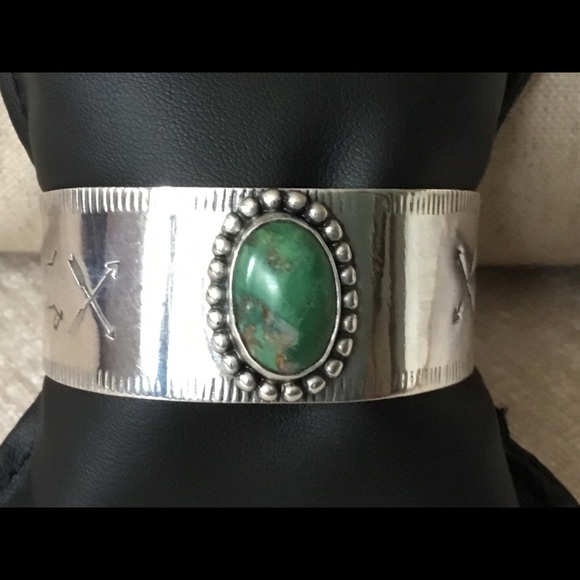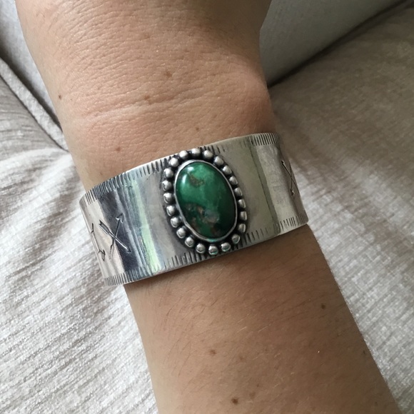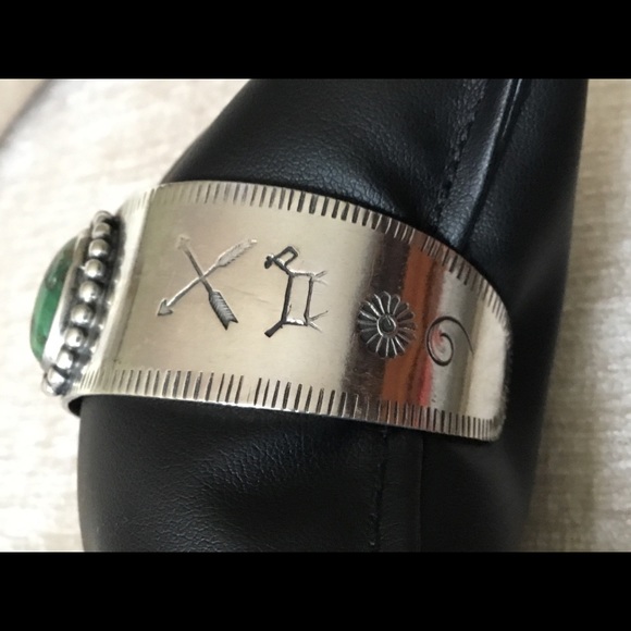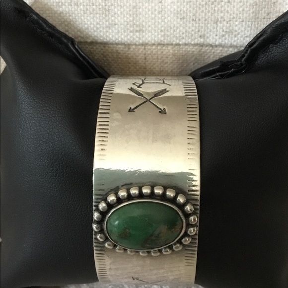 This is a vintage sterling silver handcrafted Navajo cuff bracelet. It has a beautiful green bezel set Turquoise stone, And it is 2 2/8” diameter.It has engraved arrows, horse...