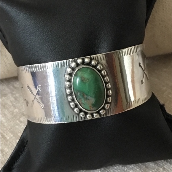 This is a vintage sterling silver handcrafted Navajo cuff bracelet. It has a beautiful green bezel set Turquoise stone, And it is 2 2/8” diameter.It has engraved arrows, horse sun and squiggles on each side of the cuff.It is stamped sterling and is approximately 38.6 Grams. Firm On Price