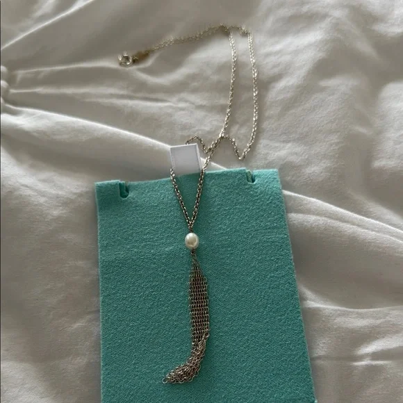 Chic Tiffany & Co. necklace with a silver chain and elegant pearl drop. Ideal for a refined look.