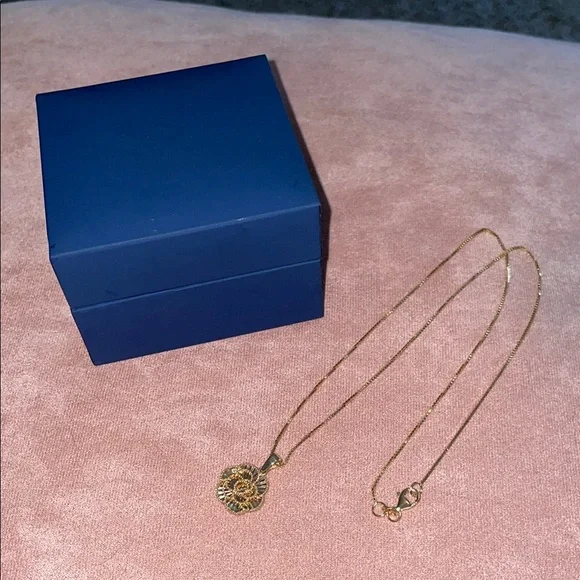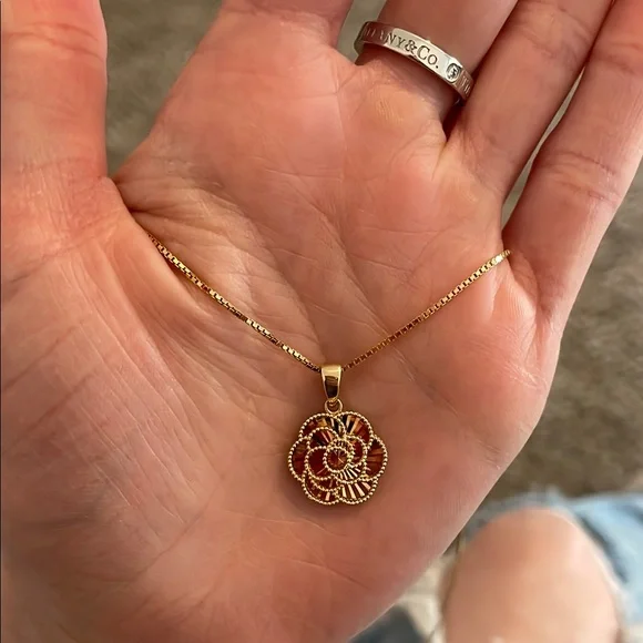 14K yellow gold floral pendant on an 18” 14k yellow gold chain. Diamond cut, sparkles when the light hits it. Made in Turkey. Comes in original jewelry box (box made in China)....