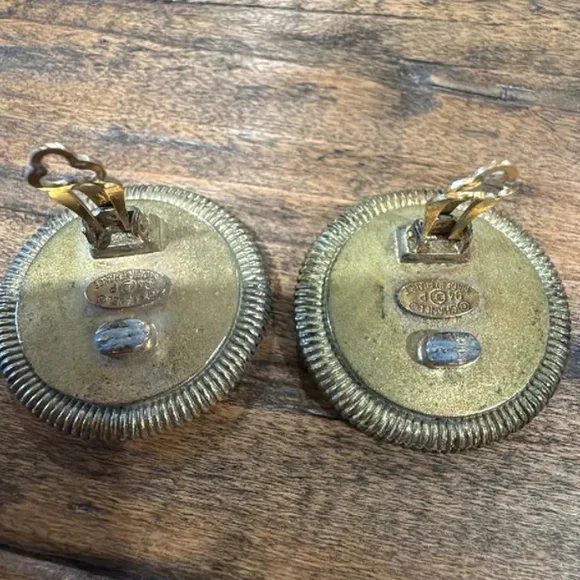 These exquisite Mother of Pearl earrings showcase a harmonious blend of gold and white, featuring a sophisticated circular design. The gold-tone border elegantly frames a white center, creating a timeless and luxurious look. Perfect for adding a touch of elegance to any ensemble.
