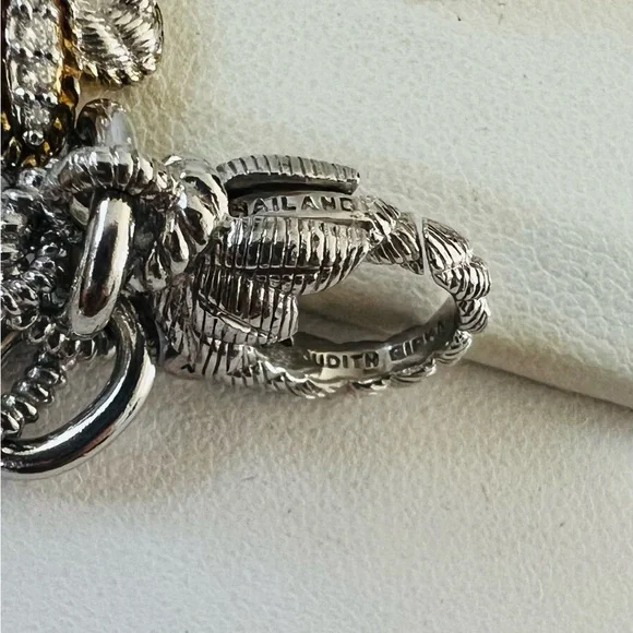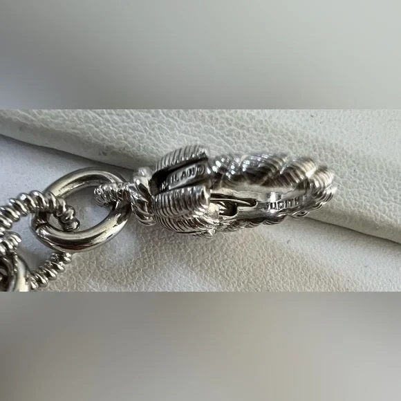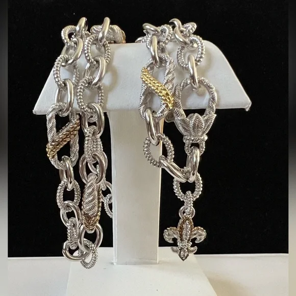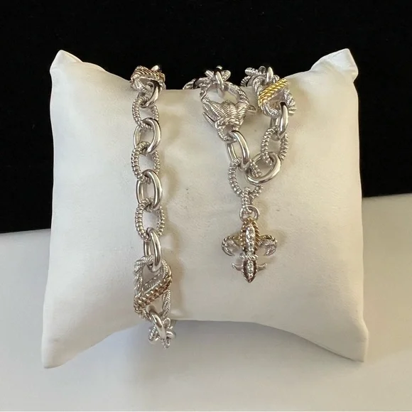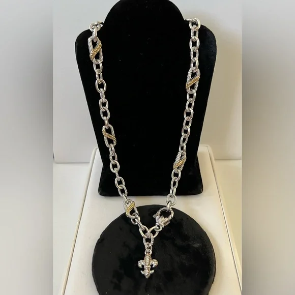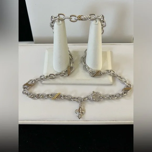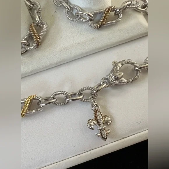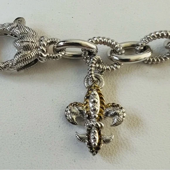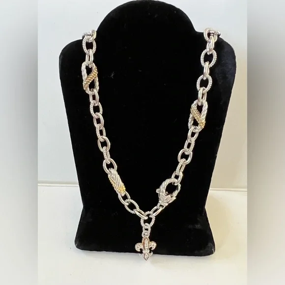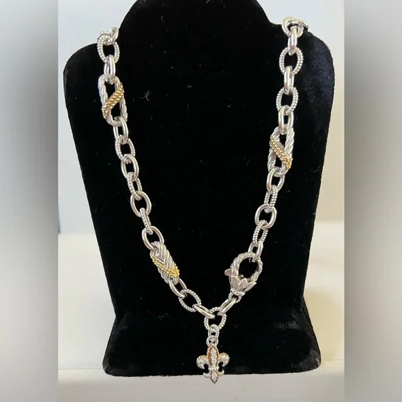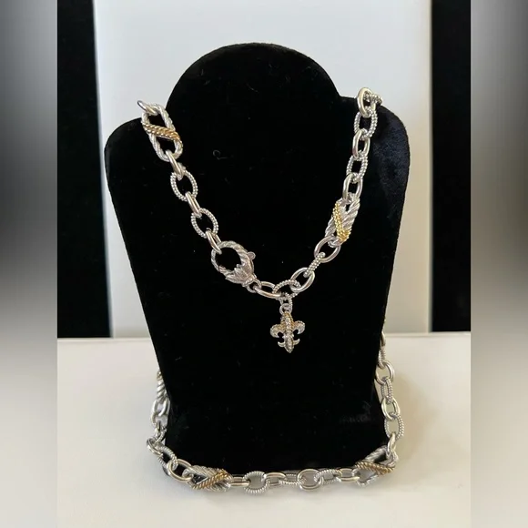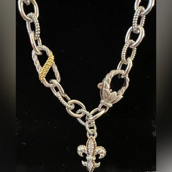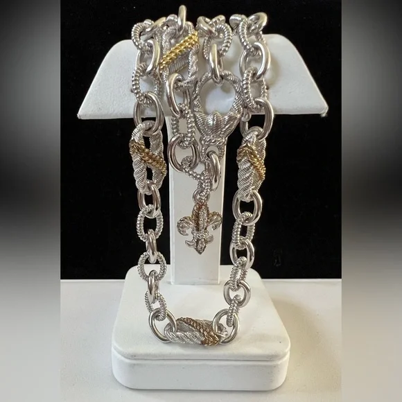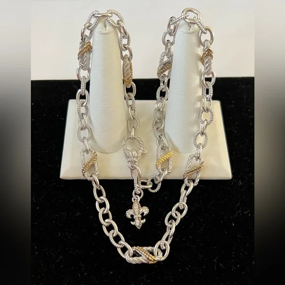 • Vintage Signed Judith Ripka Sterling Vermeil CableLInk Necklace• Sterling Vermeil Fleur-de-Lis Charm with CZ Accents• Gorgeous Textured Heavy Oval/ Oblong LinksNecklace•...