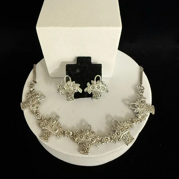 Elegant Estate Sterling Marcasite Flower Basket Parure