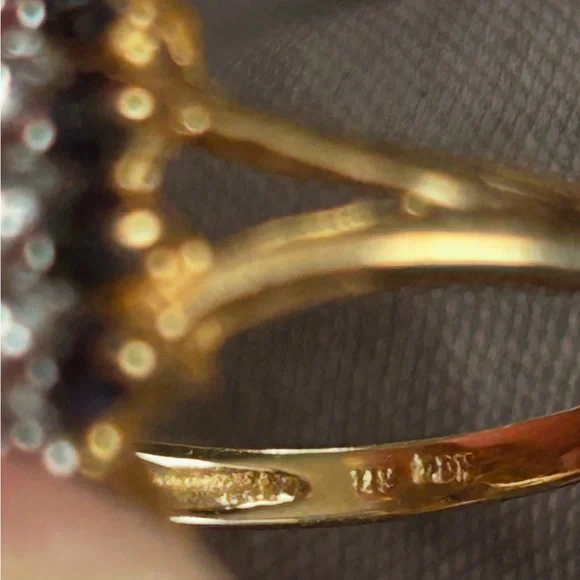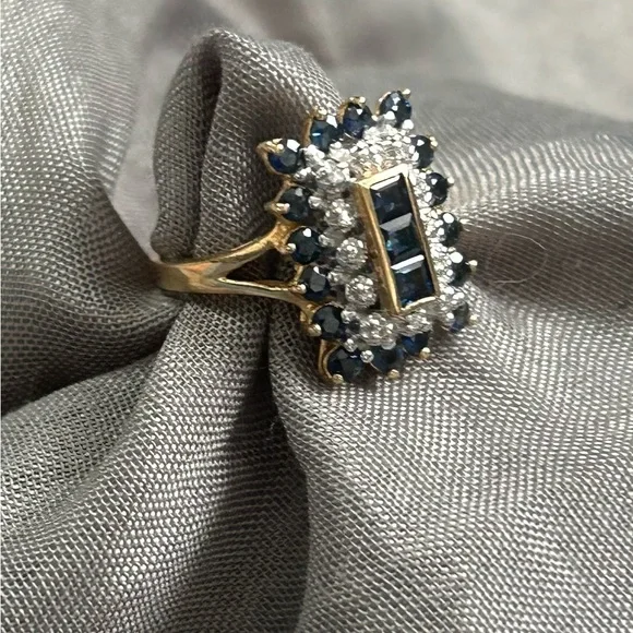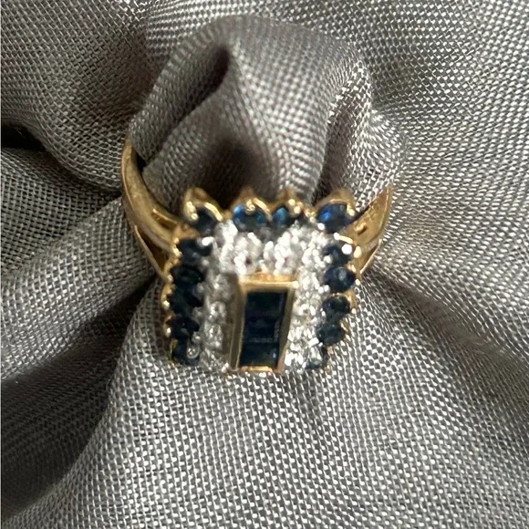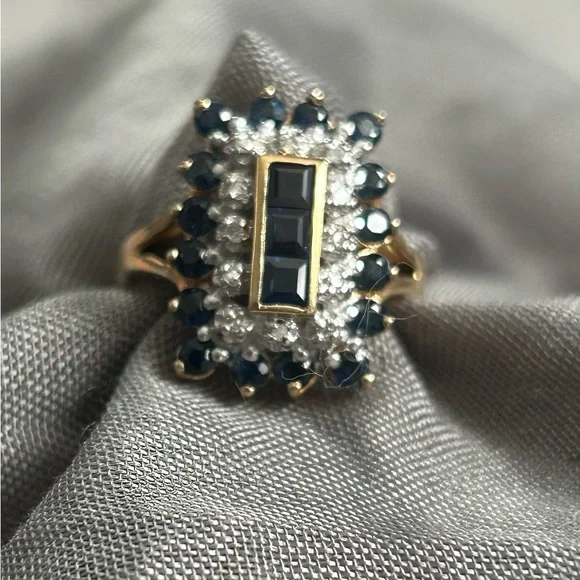 Women’s size 6 1/2 vintage style halo sapphire 14 K gold ring. Excellent preowned condition.