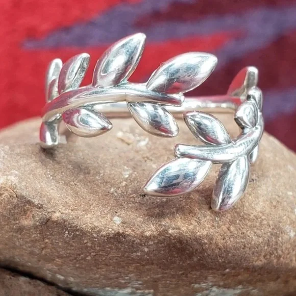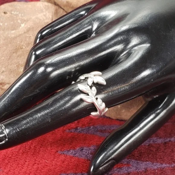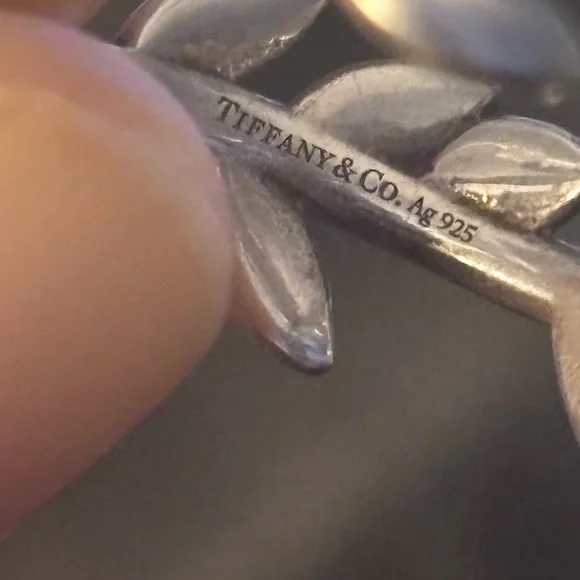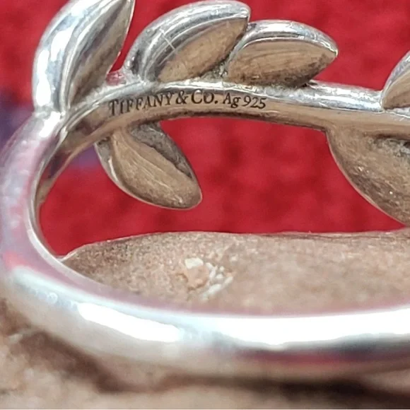This Tiffany & Co. Paloma Picasso Sterling Silver 925 Olive Leaf Bypass Ring is a size 7. Since it doesn’t connect there is some give and take to the size 7. It is a stunning piece of fine jewelry. This elegant ring features a leaf-shaped design with a bypass style, crafted from high-quality sterling silver. A beautiful tribute to the olive branch, a symbol of peace and abundance. The intricate detailing and sleek band width of 1mm make it a stylish and versatile accessory for any occasion. The iconic Tiffany & Co. Paloma Picasso collection, original designs copyrighted by Paloma Picasso. This ring is a timeless piece that adds a touch of sophistication to any look.The ring is in excellent condition and comes with pouch and box!