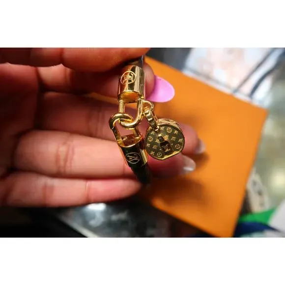 You’re looking at a 100% authentic Louis Vuitton “Tribute” Bracelet in the classic Monogram canvas. This chic piece features:•Monogram coated canvas exterior•Natural cowhide leather lining (as labeled: “Textile enduit, Intérieur cuir de veau”)•Gold-tone hardware with a secure clasp closure•A LV trunk charm and coin medallion that dangles elegantly for added flair•Stamped inside with serial/QR code (visible tag: M6442E / BC LV TRIBUTE MNG 19)Condition:Preowned and in good condition. Minor wear. gold plated hardware has light cuffs but still shiny. Circumference: 7"Ornament-Length: .75"Ornament Width: .5"Metal Type: Brass, Gold-PlatedMarks: Designer Signature, Model Number, Size, Date Code, Made in Spain, PARISTotal Item Weight (g): 15.4Non-Gem Materials: Leather, CanvasCollateral: Jewelry Pouch, Designer Box