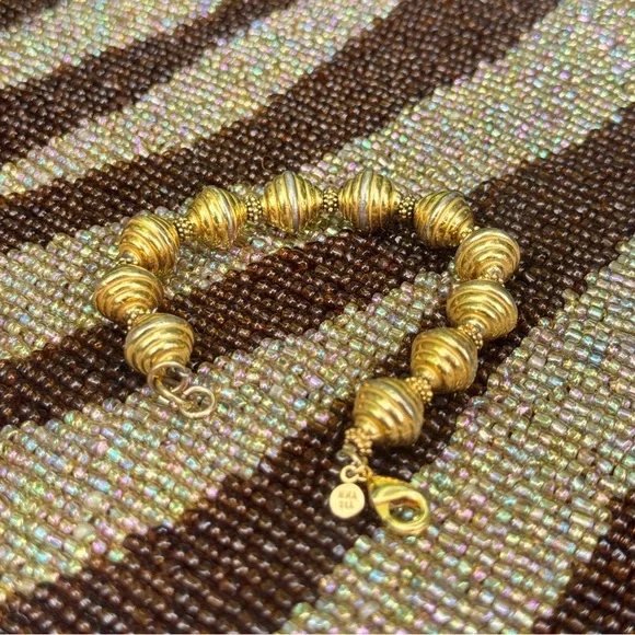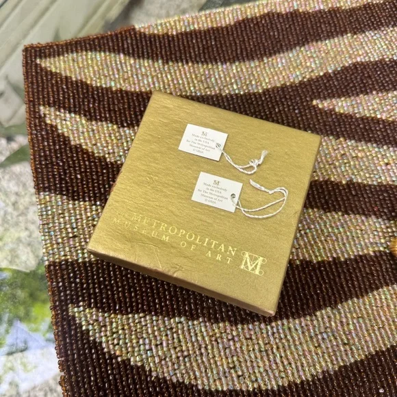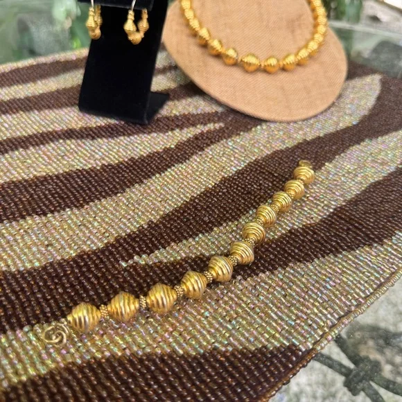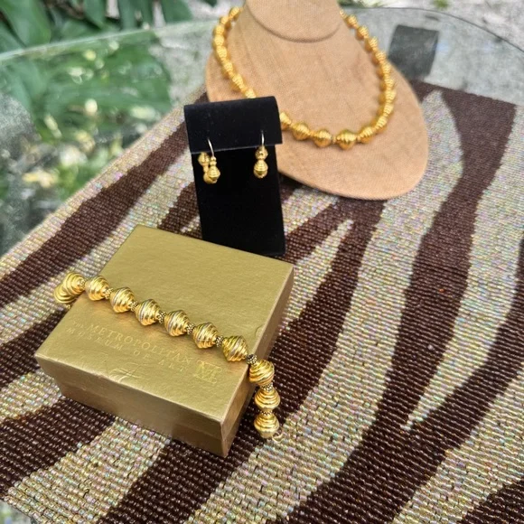 This exquisite vintage Persian inspired gold set includes a pair of mini beaded huggy hoops, a matching necklace and bracelet. This set was originally purchased at the metropolitan museum of art gift shop. The set comes with its original box and tags.17” necklace7” bracelet3/4” hoops