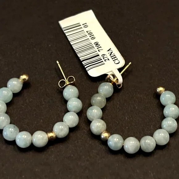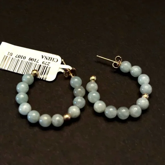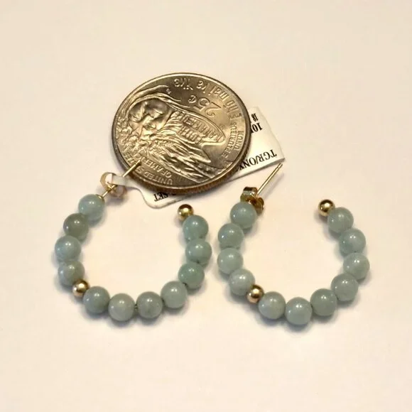 10K Solid Gold GREEN JADE 5mm Beaded Hoop Earrings NWT
