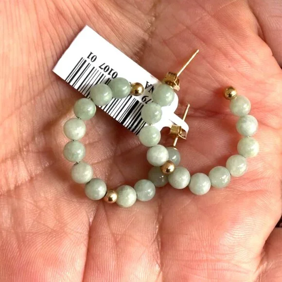 10K Solid Gold GREEN JADE 5mm Beaded Hoop Earrings Item Details:Metal: 10k Yellow GoldStone: JadeAge: ModernItem Measurements: 1 inch in DiameterItem Condition:New With Tags AttachedItem Comes From a 100% Smoke Free Home