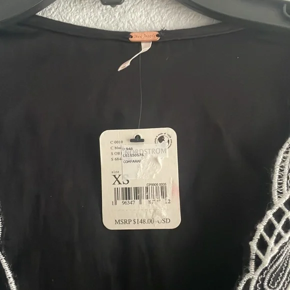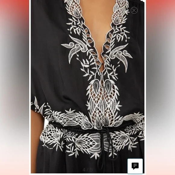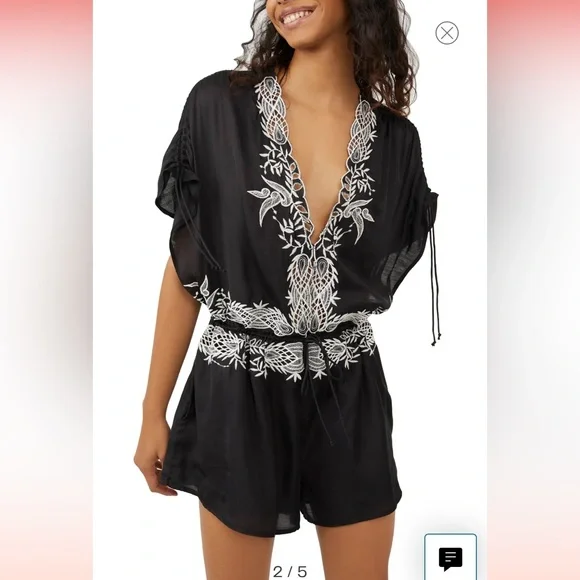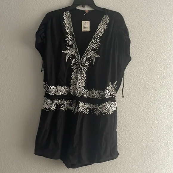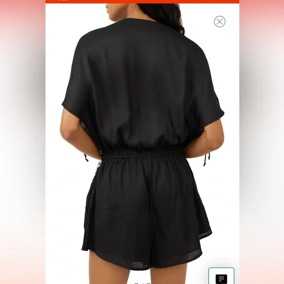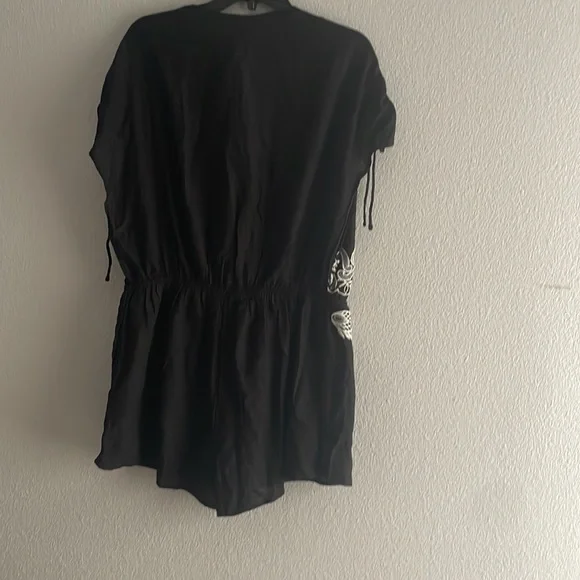 Delicate lace trims this breezy romper designed with a dipped neckline and dainty defining ties.V-neckShort sleevesLined100% modalMachine wash, tumble dryNew with tags