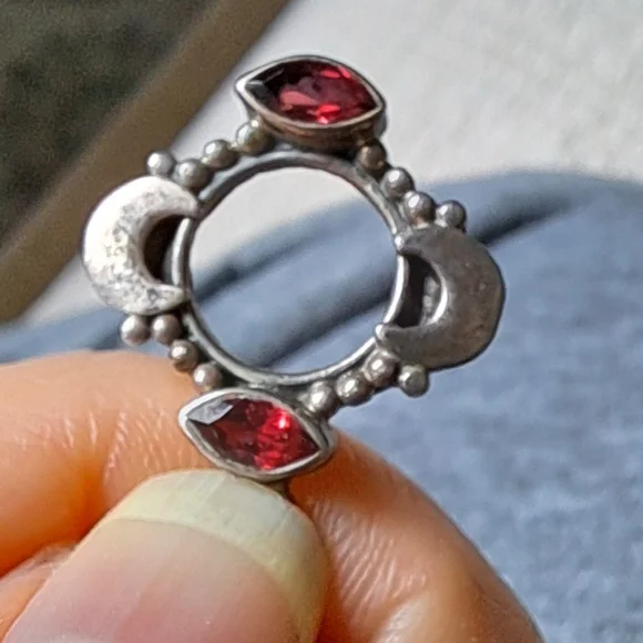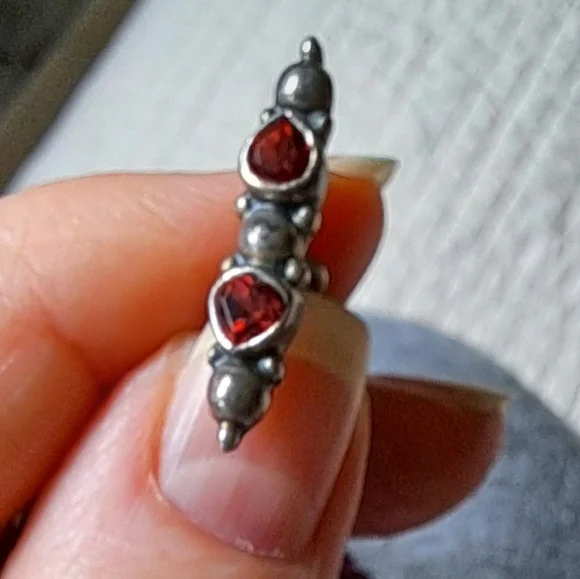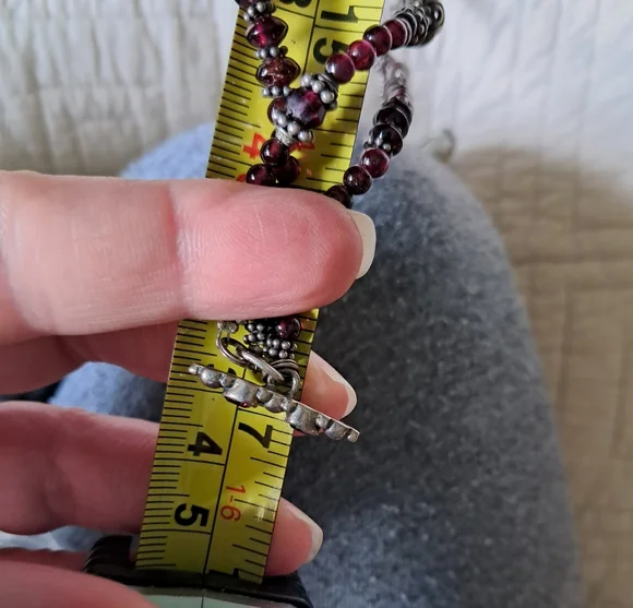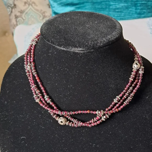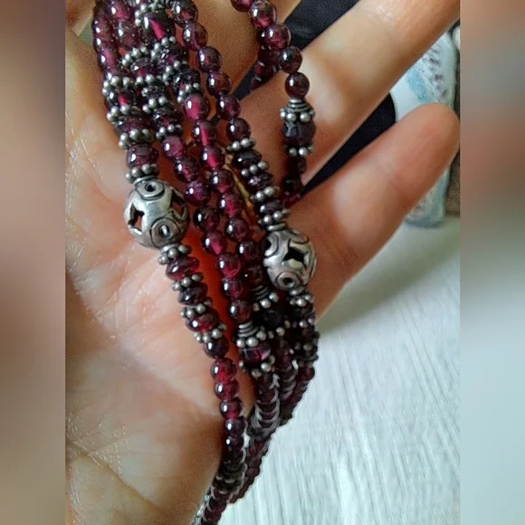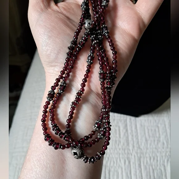 This elegant antique Bohemian blood garnet necklace is made from multiple strands of hand made blood garnets interspersed with handmade carved Sterling silver beads. A stunning 17", the toggle has faceted garnets set to add an additional touch of beauty to the necklace.hippie