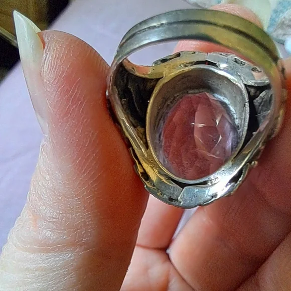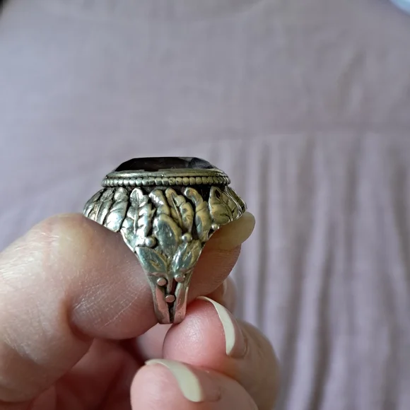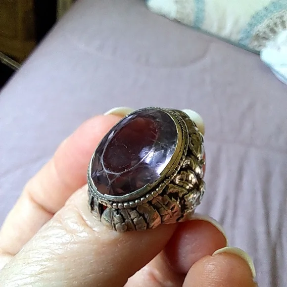 Elegant antique substantial amethyst Sterling silver ring. Handmade with heavy Sterling silver floral motif and beautiful detailing along the bezel setting. Some wear on the stone...
