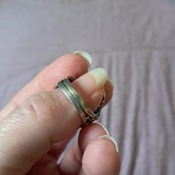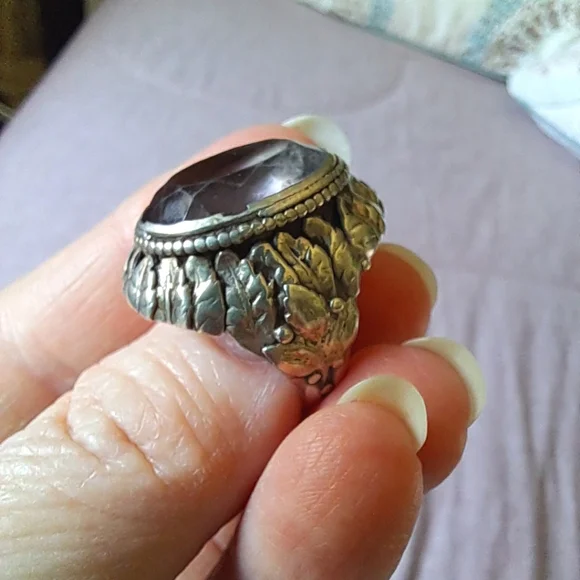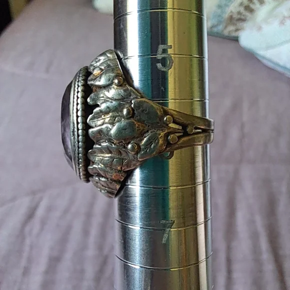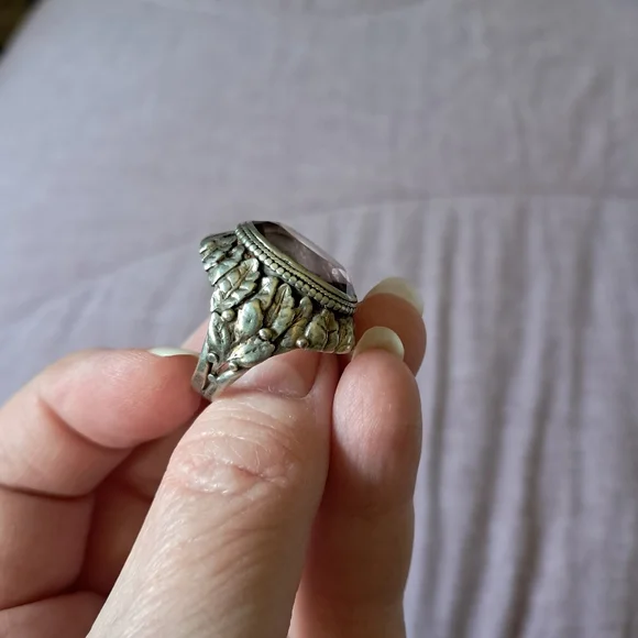 Elegant antique substantial amethyst Sterling silver ring. Handmade with heavy Sterling silver floral motif and beautiful detailing along the bezel setting. Some wear on the stone due to age. Truly gorgeous piece. Not marked but tested using Niton DXL Precious Metal Analyzer as Sterling. Size 6.