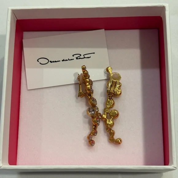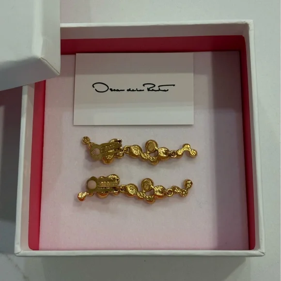 These exquisite Oscar de la Renta earrings feature a stunning gold filigree design that exudes elegance and sophistication. The drop style adds a touch of movement, making them perfect for any occasion. Crafted with meticulous attention to detail, these earrings are a timeless addition to any jewelry collection.Details- Clip Backs with Comfort Pads- European Crystal GlassMaterials & Care- 95% Brass, 5% Strass