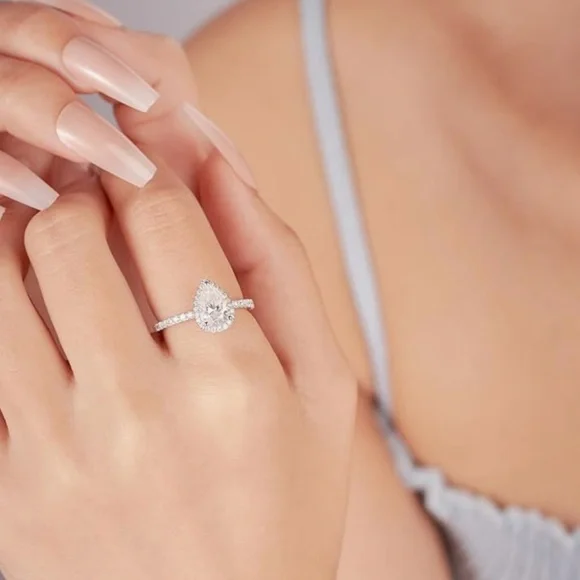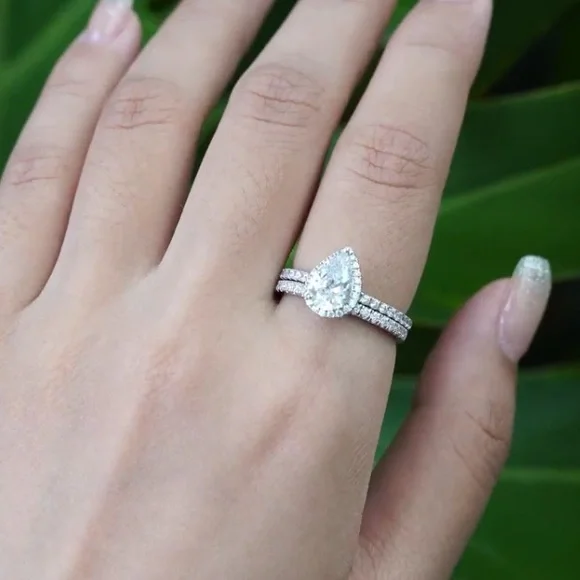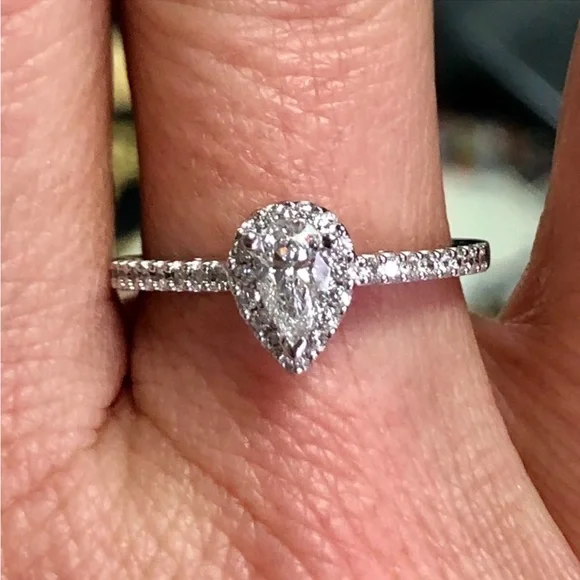 18k White Gold Pear Diamond Halo Engagement Ring ~ Moissanite BridalStunning bright, eye clean genuine diamonds!Center pear shaped moissanite diamond with round brilliant cut moissanite diamonds in a halo around the center stone. Moissanite Diamonds go down each side of the band.•NEW!•Custom made •Retail Price - $599•Finish - 18k White Gold•Metal - 925 Sterling Silver•Weight - 1.65 ctw•Center Stone - 1 Carat / Side Stones - 0.65 ctw•Color - D•Clarity - VVS1•Gift Box & Cleaning Cloth Included!#080150-70Multiple sizes available.If your size isn’t listed, please message me. Our jeweler can size this for no extra charge.••ALSO AVAILABLE WITH GENUINE DIAMONDS & SOLID GOLD••PLEASE MESSAGE FOR PRICING••New NWT jewelry minimalist bridal engagement wedding anniversary pear shape teardrop halo 18k white gold solid cluster genuine natural solid real vermeil custom made ring genuine certified certificate of authenticity warranty dainty bling 925 sterling silver diamond alternative conflict free