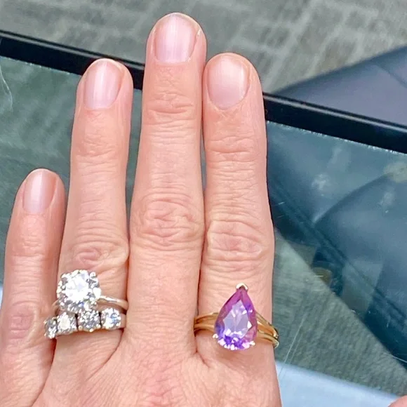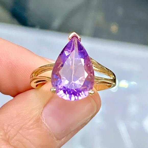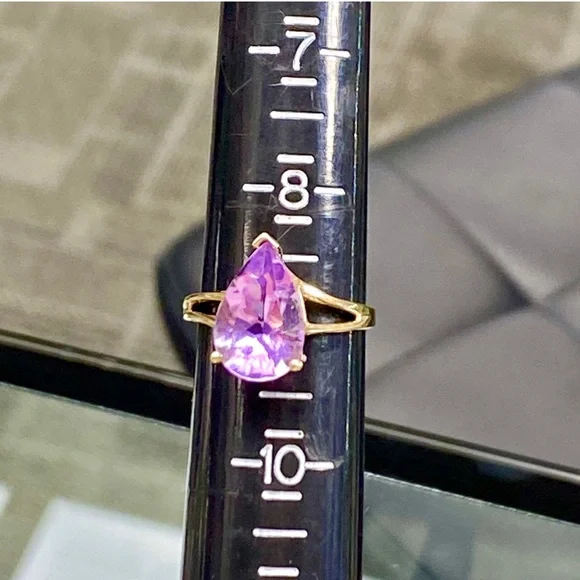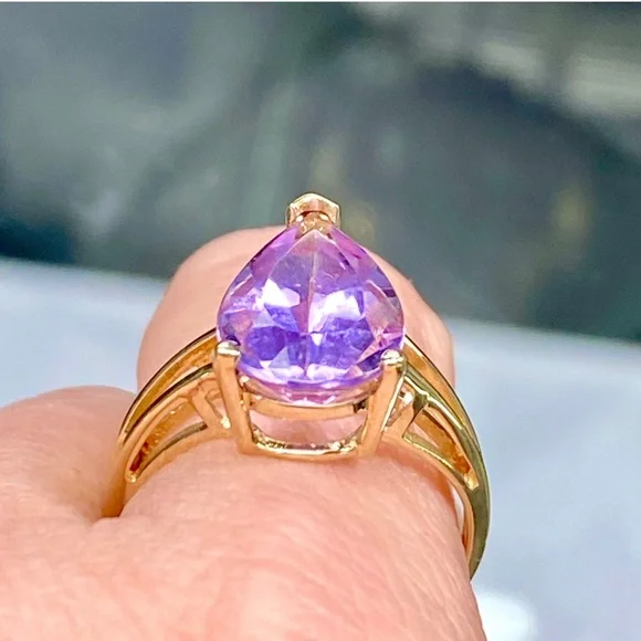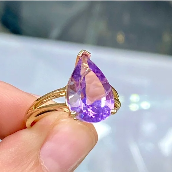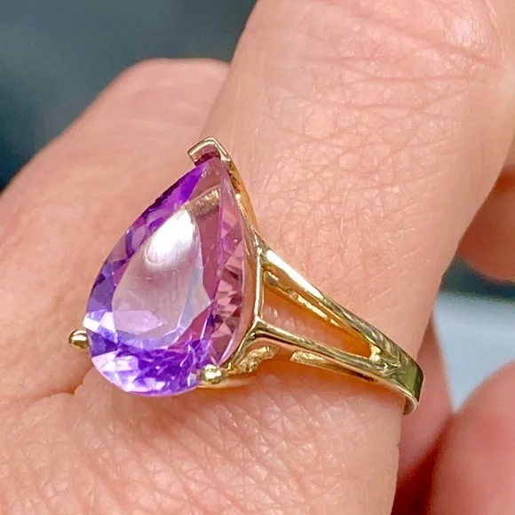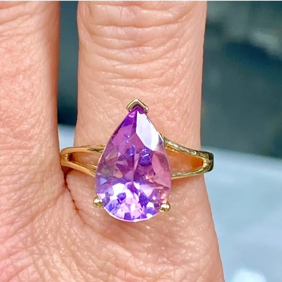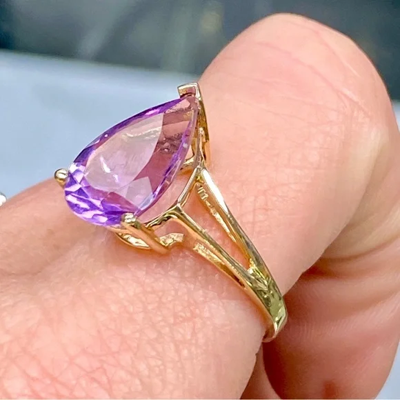 10k Yellow Gold 5 Carat Pear Shape Amethyst Ring - Teardrop Birthstone Ring•NEW! Never Worn!•Retail Price - $339•Solid 10k Yellow Gold•Total Weight - 5 Carats•Natural Amethyst - Stunning Color!•Size - 9, can be sized to fit you•February Birthstone•Gift Box & Jewelry Polishing Cloth included#0801120Stunning pear shaped 5 carat genuine Amethyst gemstone in a 10k yellow gold split shank ring. Solid gold, natural gemstone, genuine diamonds. Big look!Perfect cocktail, dinner, statement, fashion or birthstone ring!New, NWT, jewelry, statement, 10k yellow gold, gem, precious gemstone, real, solid, natural, genuine, authentic, February birthstone, purple lavender stone, large teardrop stone, 5ct, antique scroll, solitaire, trendy engagement bridal statement promise wedding ring, 5 carat, mid finger, knuckle, Barbie, barbiecore, bling maximalist birthday Christmas anniversary graduation wedding bridal promise fashion magical royalty solitaire teardrop pear sexy