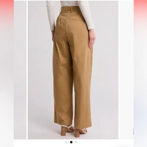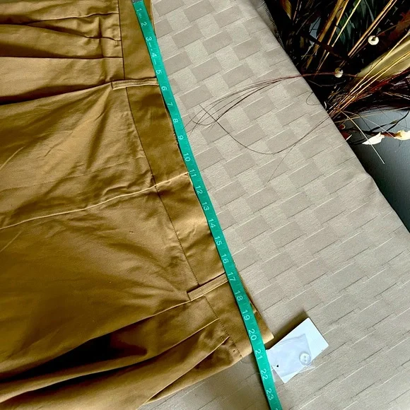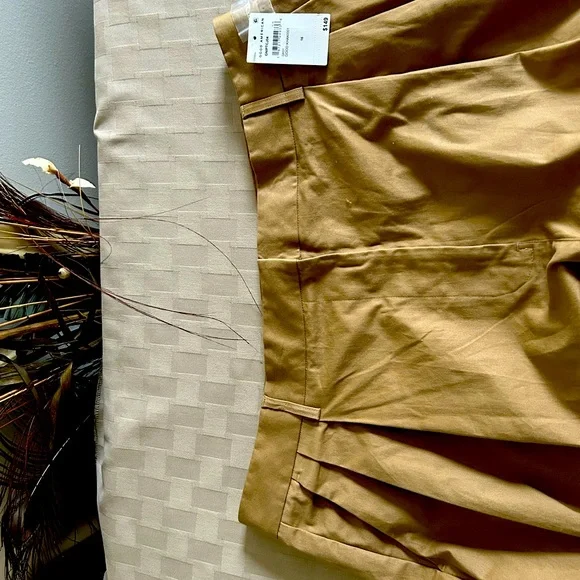 Measurements and fabric comps in pictures High waisted silhouette with pleated crisp pleats in stretch cotton blend fabric, front slant pockets, zip fly with hook and bar closure In excellent new with tag condition