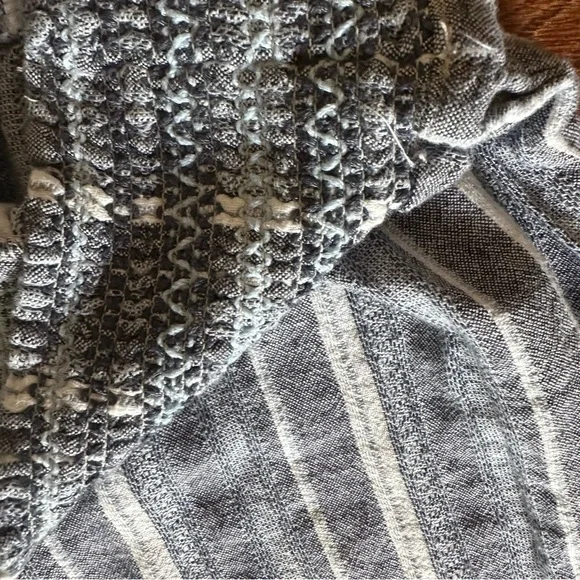 Stylish textured pants. Features a blue and white pattern. Perfect for any occasion.