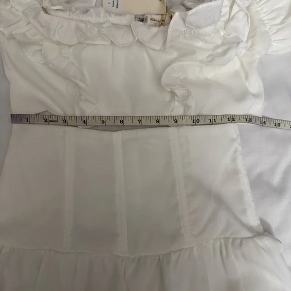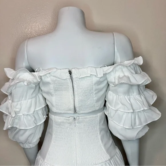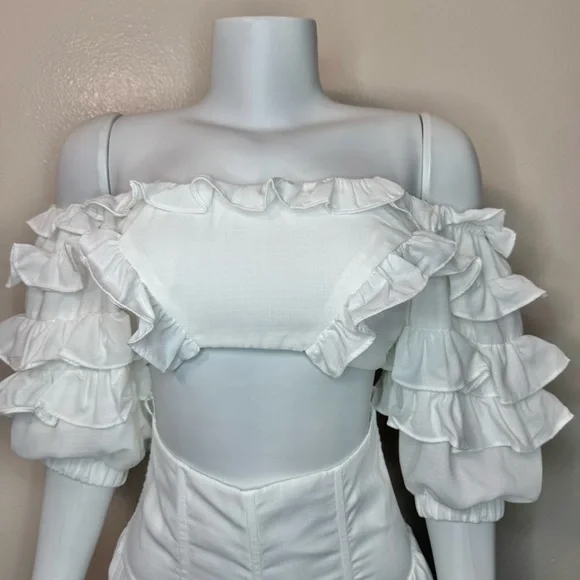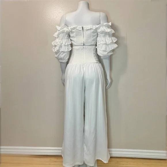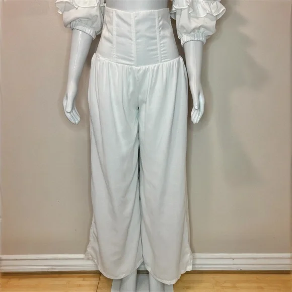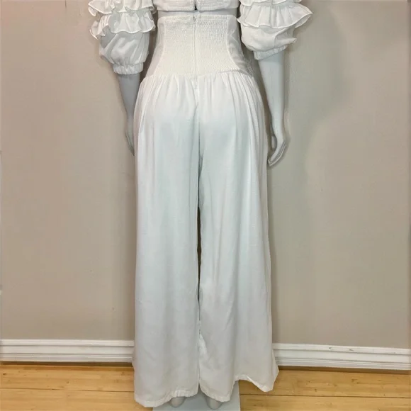 White off the shoulder ruffle crop top high waisted wide leg pants set color: white size: small Linedbrand: Rose Velvet shirred back on the top boning on the pants high waisted pants zipper in the back for closures material: Self: 100% polyester. Lining: 95% polyester, 5% spandexAll measurements are approximate and taken laying flat: TOP pit to pit: 15 1/2 incheshem: 13 1/2 incheslength: 5 1/2 inchesPANTSwaist: 13 inchesLength: 43 inchesTags for exposure: white pants wide leg pants high waisted pants crop topLocation: TOTE: #17