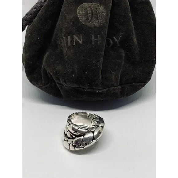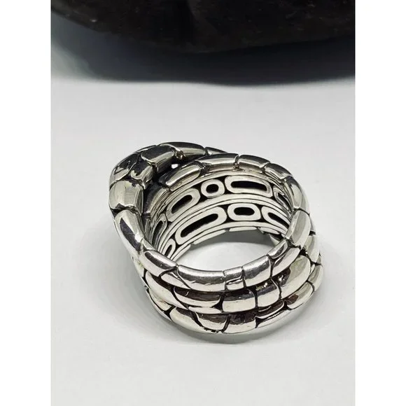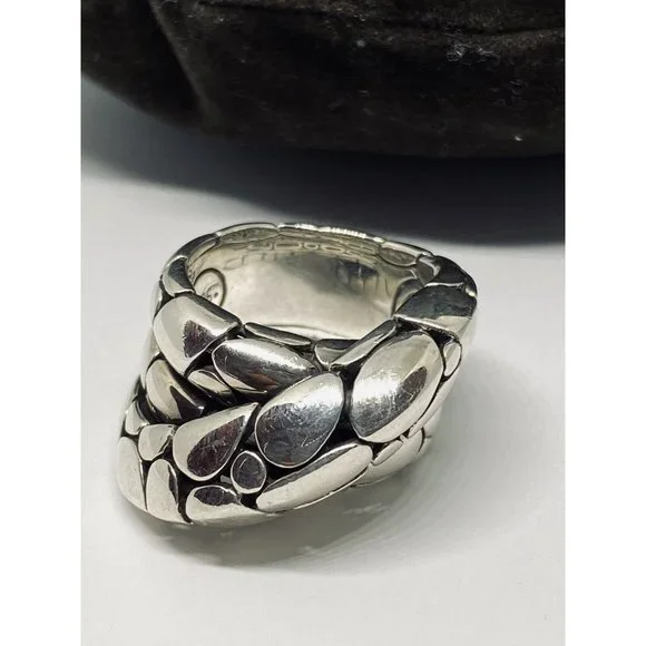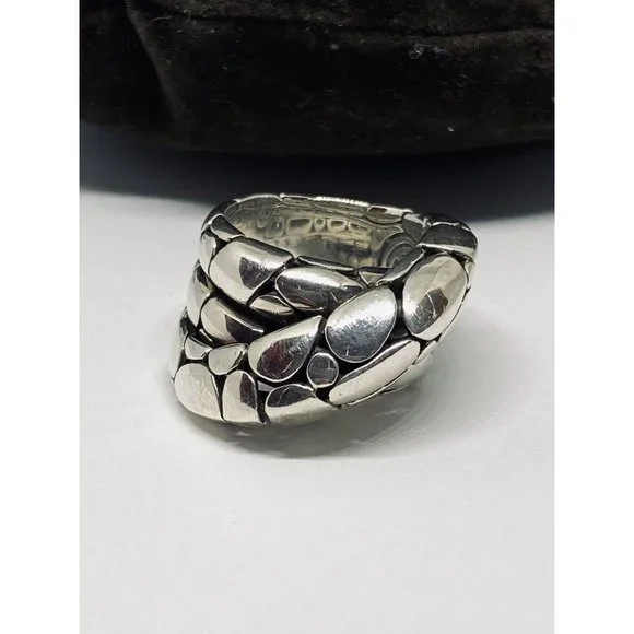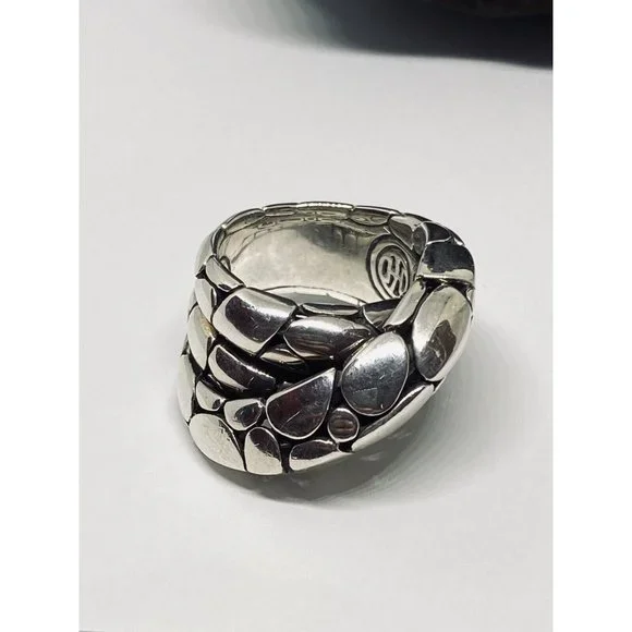 John Hardy Classic Pebble Sterling Silver Overlap Ring Sz 7.5. Exquisite, classic ring designed by John Hardy!Pebble pattern band with three layers overlapping each other.Marked: “925” with infinity symbol and designer’s hallmark of overlapping J and HWeight: 16.9 gramsOverall band is 1/2” thick at largest pointSize: 7