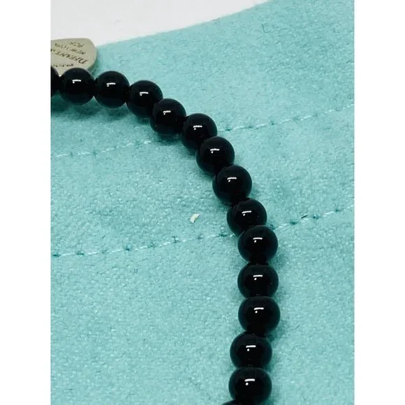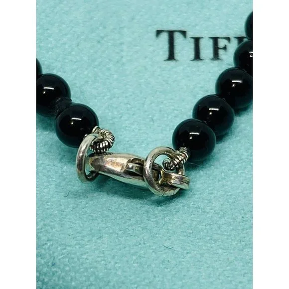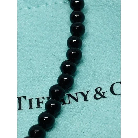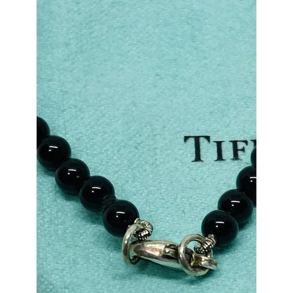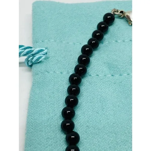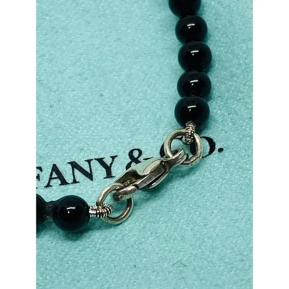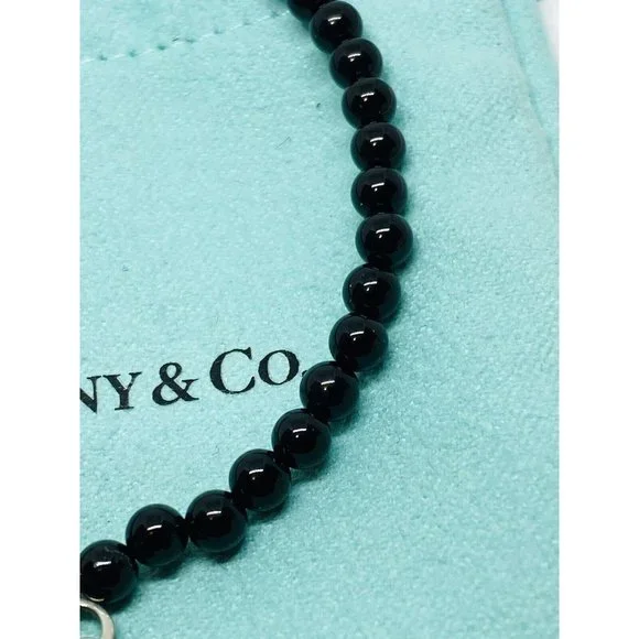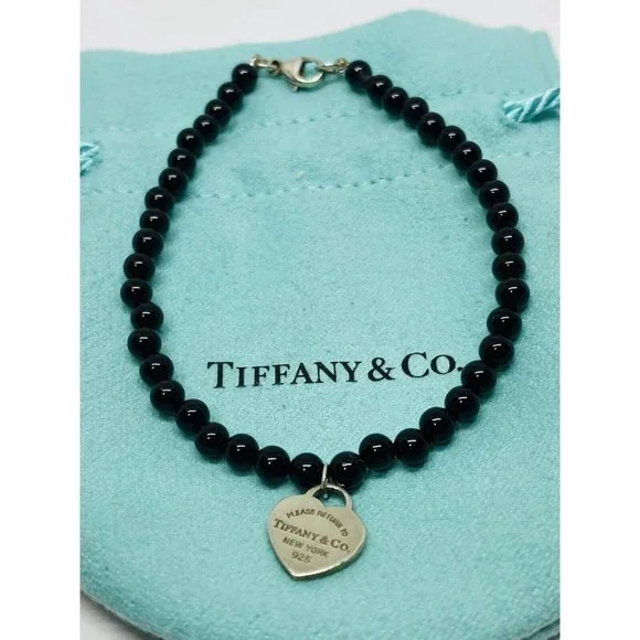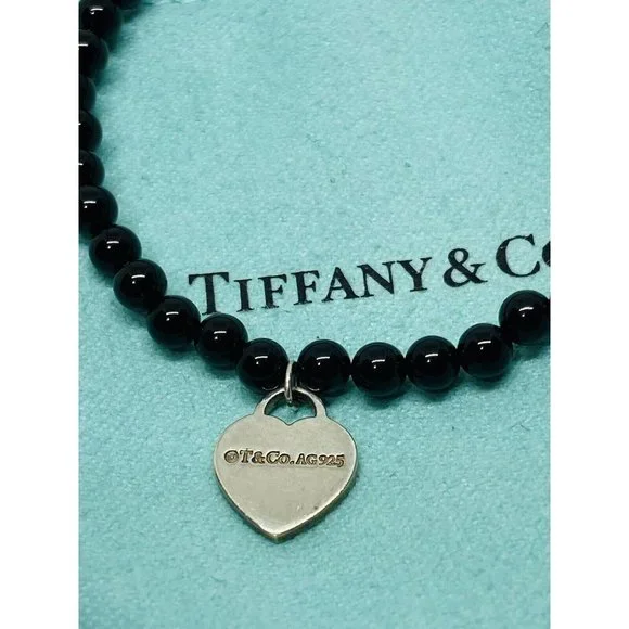 Tiffany & Co. 925 Silver RTT Heart Tag 8mm Black Onyx 7.5” Bracelet (Pouch). Pre-owned.In pristine condition.This is an authentic Tiffany & Co. 925 silver 4mmblack onyx RTT heart tag bracelet.The black onyx beads are 4mm in size.Heart tag is 10x11mm.Bracelet length is 7.5" and fits max wrist size of 6.5".Comes with Tiffany blue pouch.