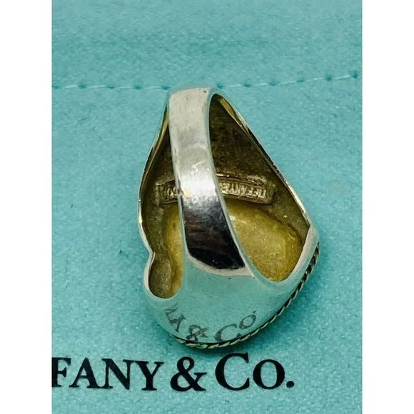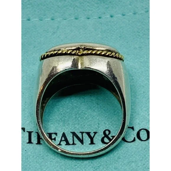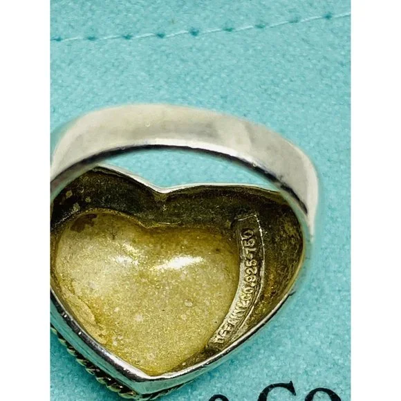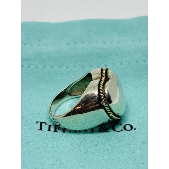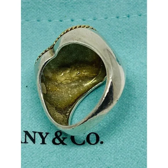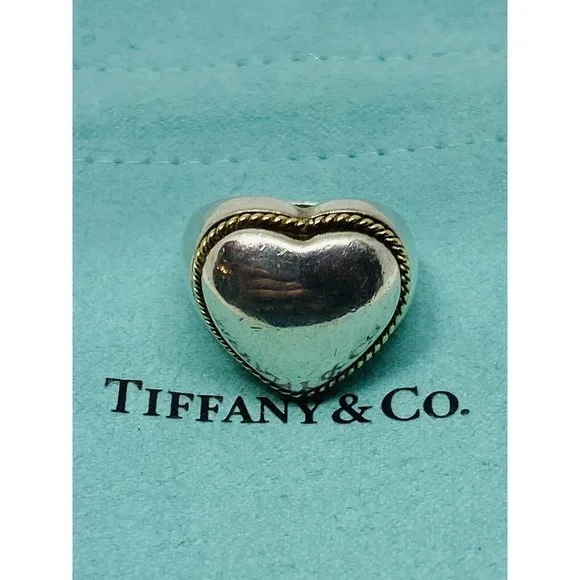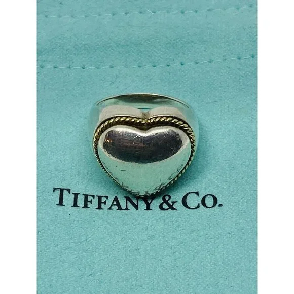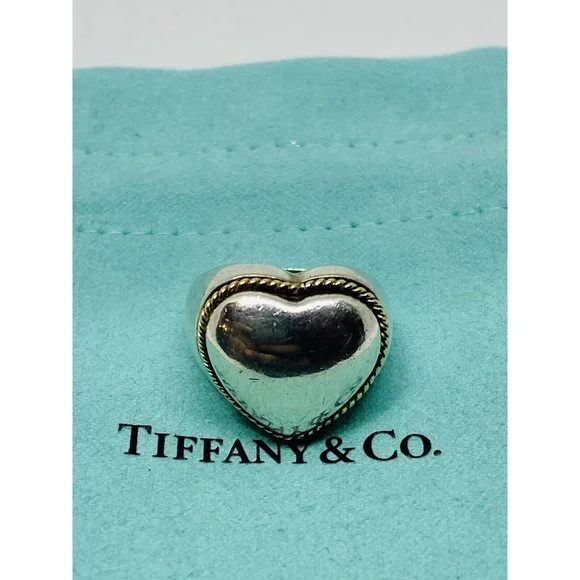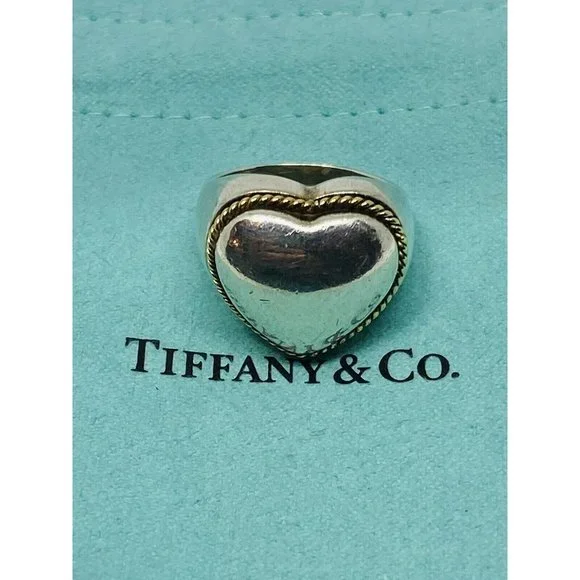 Size 5.5 Tiffany Twist Rope Puffed Heart Ring in Silver and 18K Gold Vintage. Guaranteed Authentic Tiffany & Co Silver & Gold Heart Ring Size 5.5Width of heart is 0.68" Weight is 7.6 grams.Does not come with pouch