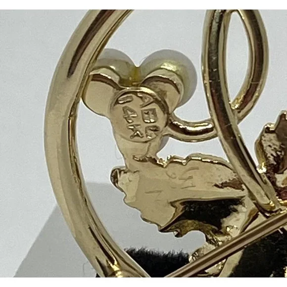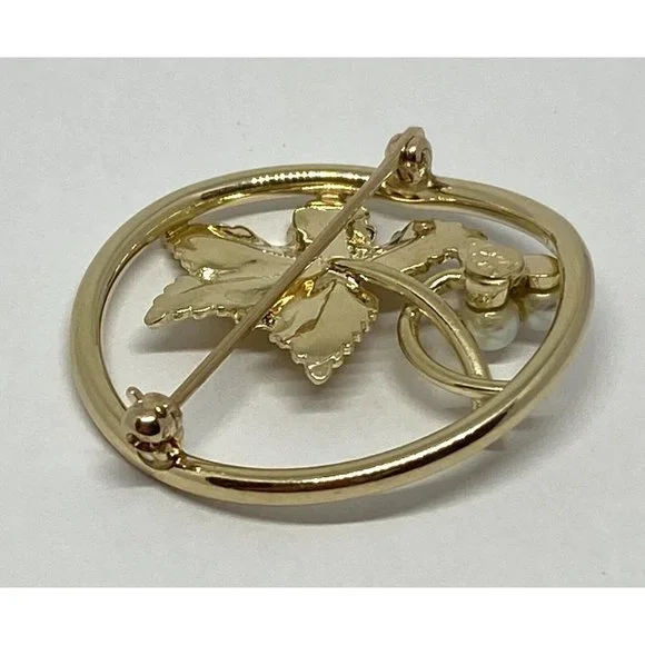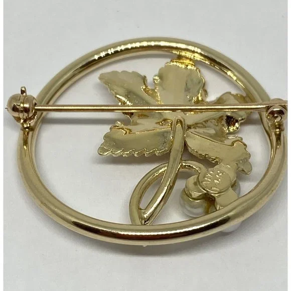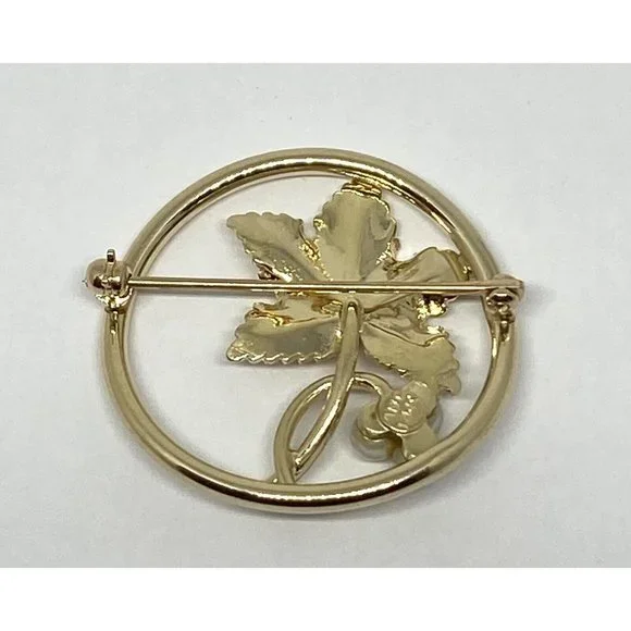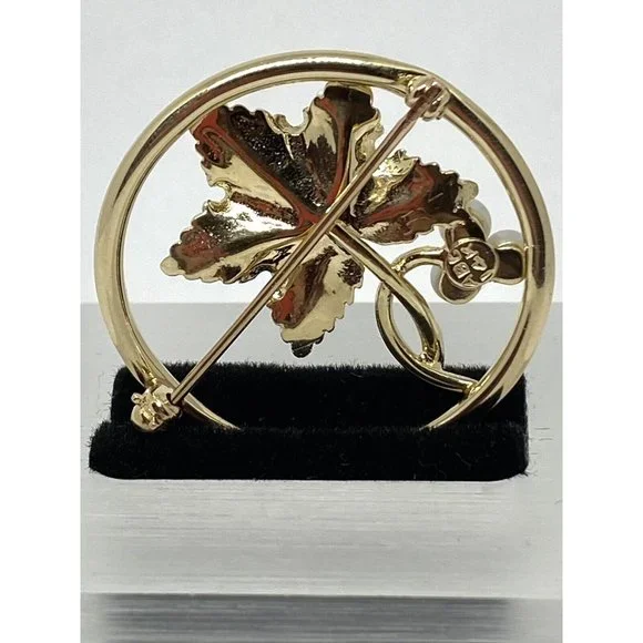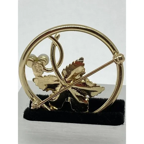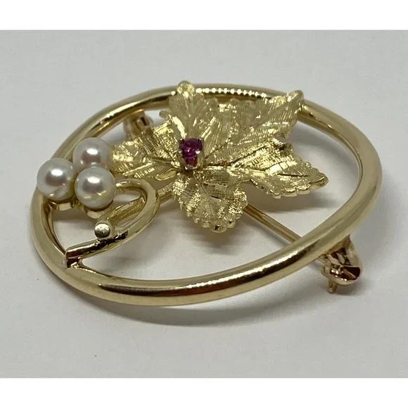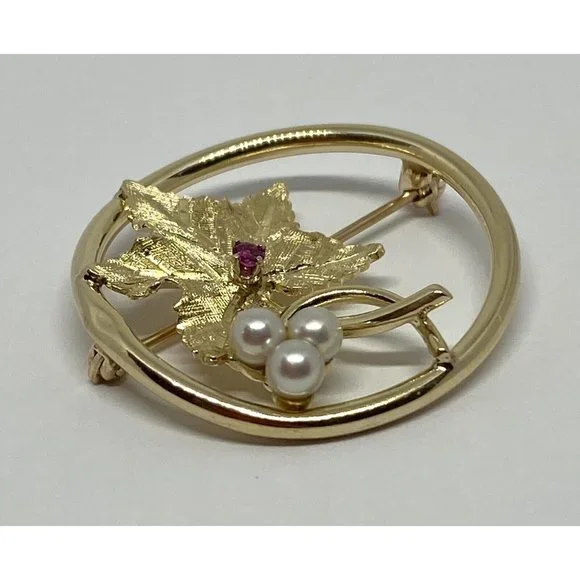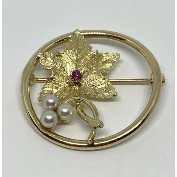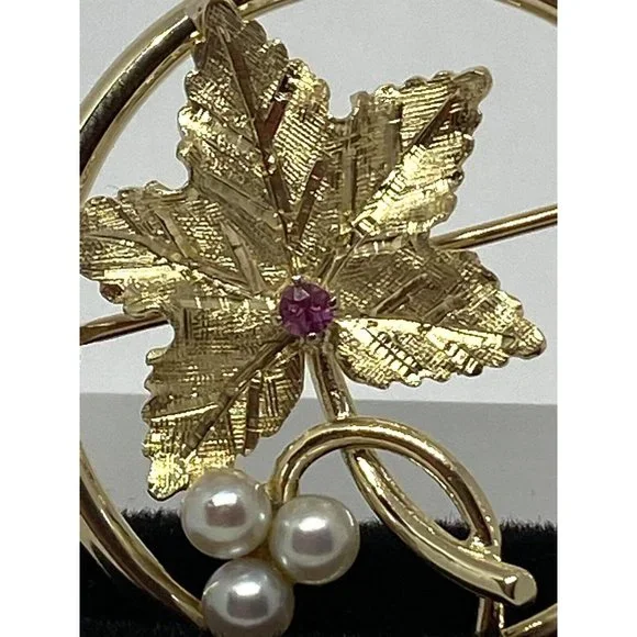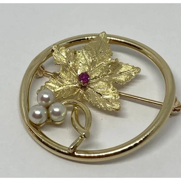 14K Gold Ruby Pearl Vntg Maple Leaf Circle Brooch, measures about 1 2/8” and has 4.8 grams of gold.