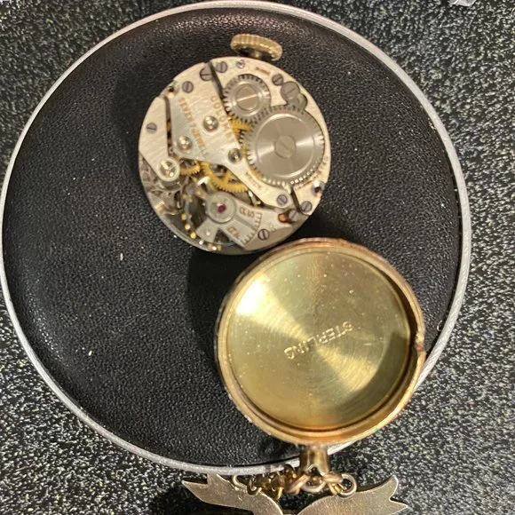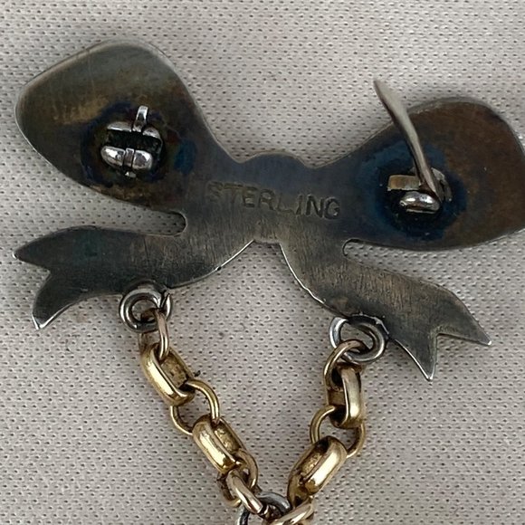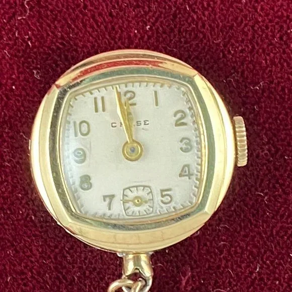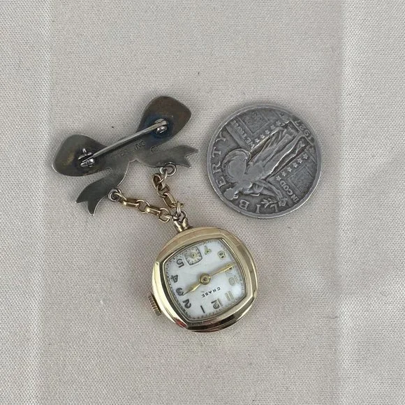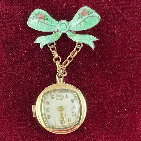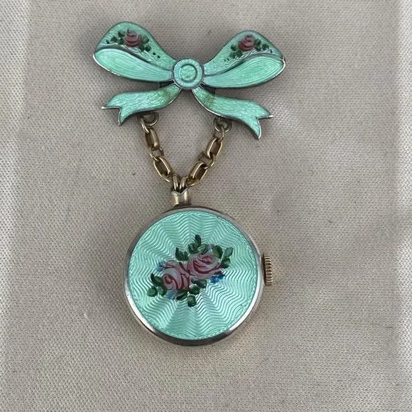 Vintage Extremely Rare Chase Pin Watch in Sterling Silver Vermeil and in working condition with a reverse hand made Stunning Green Guilloche Enamel with Pink Rose hangs beneath a Sterling Silver Green Bow also with small rose buds Brooch Pin 2.15 inches tall 125 inch wide Rose Bow watch is 7/8 inch in diameter. This is Hand made from the late 30’s to early 40´s Colomby 7 Jewel Movement Manual watch in a sterling silver case 18 Karat Gold plated(Vermeil) known as a boy friend pin during WW2PRICE IS FIRMVintage Chase Watch working hand made Green Guilloche Enamel with Pink Roses