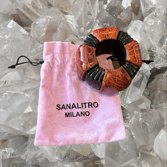 ▪️ Italian leather and ebony are used in this design by Italian jewelry designer Sanalitro▪️ this cuff is a one-of-a-kind sample from his collection▪️ this cuff has elastic and is easier to get on and off than it looks▪️ a piece from my private collection▪️ MEASUREMENTS:2.5" opening when flat (fits my 6" wrist)2" deep1" depth from skin to outside of cuffItalian jewelry designer Sanalitro has been designing and hand-crafting jewelry since 1976. Based in Milan, Massimo Sanalitro makes his jewelry from A to Z: he cuts stones from the rough (also different kind of woods) in his own workshop/lapidary. He thinks that one piece must be enough, it must be noticed for its originality and emanate light, be extreme but refined at the same time. Massimo is convinced that what distinguishes a designed jewel from a simple bizarre is the harmony between shapes and the colors. He has also been featured in Italian Vogue and Elle Italia.