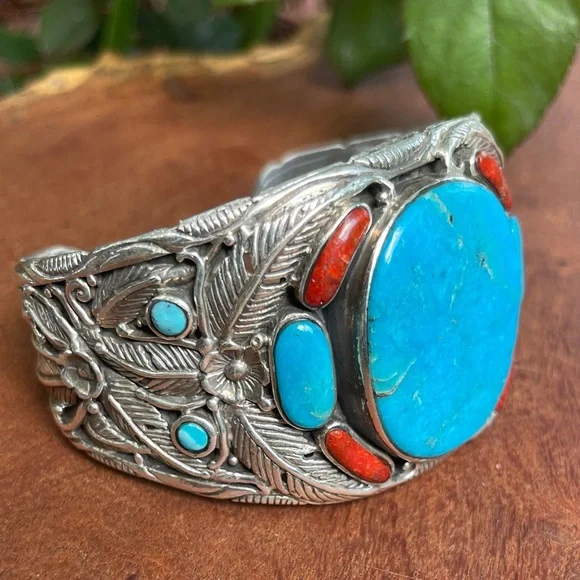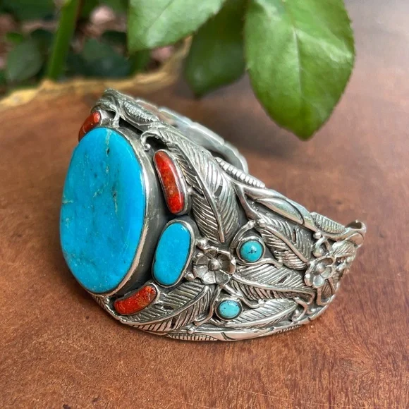 Beautiful Turquoise and Red Coral Silver Cuff BraceletElegant silver bracelet featuring vibrant turquoise and coral stones. This handcrafted sterling silver turquoise and coral cuff bracelet features an oval-shaped turquoise stone with red coral accents. This beautiful piece of jewelry exudes beauty, nature, and Western art with its intricate design and high-quality materials.
