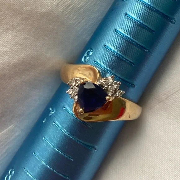 This ring has a triangular cut Iolite with 10 small diamonds set in 14K Gold. If you aren’t familiar with Iolite, it has a deep purple color. I love this ring but sadly it no longer fits. Excellent collection! Size 6.25