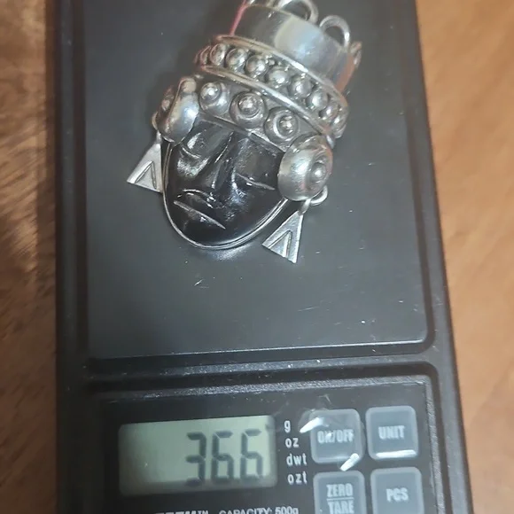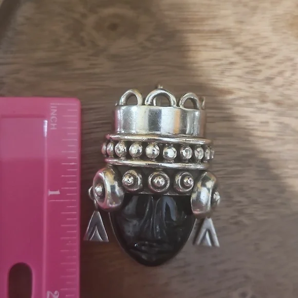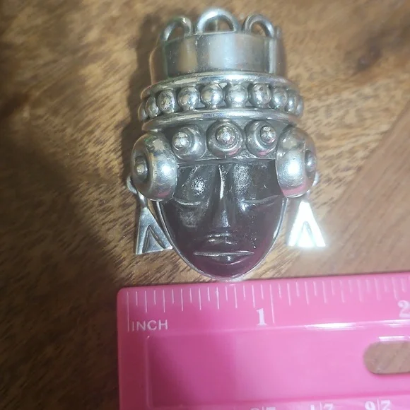 This stunning brooch is a vintage preloved piece of an estate. She is a beautiful piece and deserves to be shown off. She is a stamped piece created by Los Ballastetos, Mexico, 925 heavy silver with a carved black stone.
