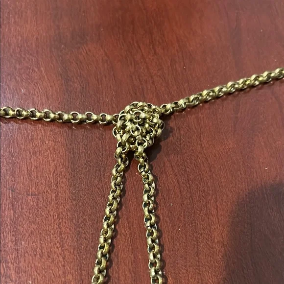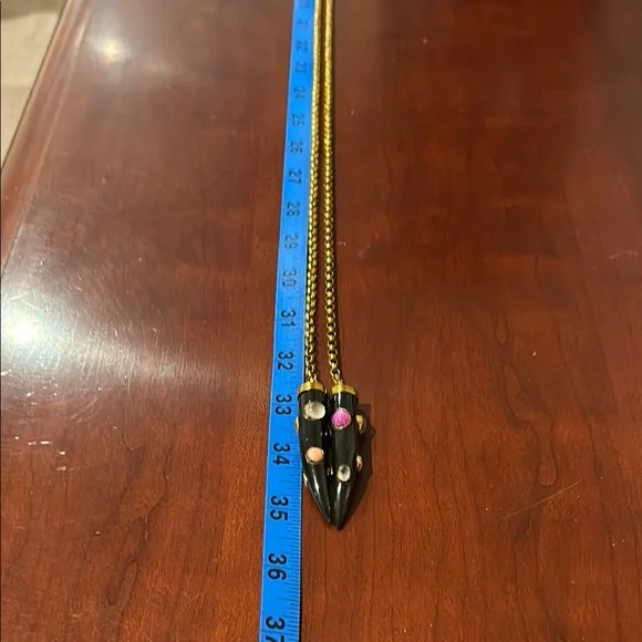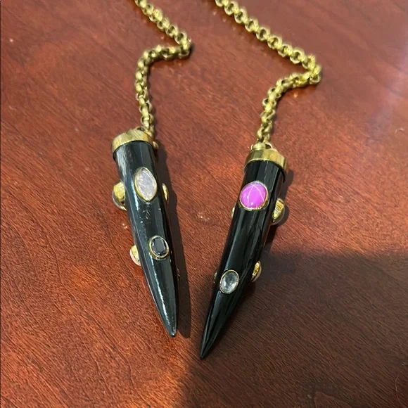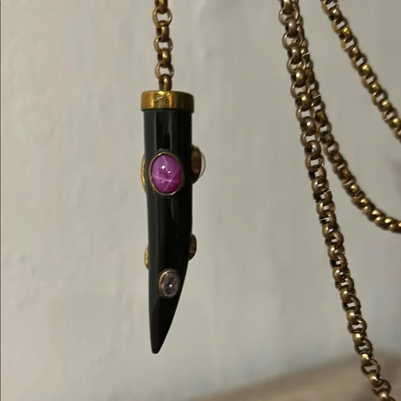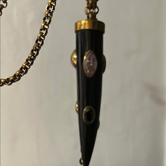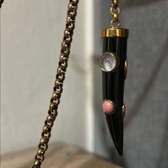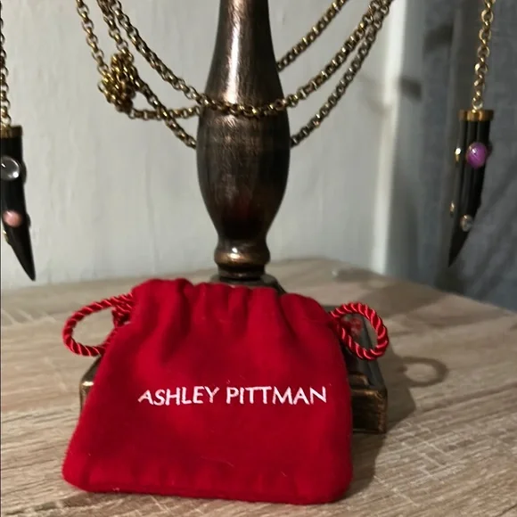 This stunning necklace showcases a harmonious blend of black and brass tones, featuring gracefully draped style chain. The ornate carved horn pendants with inlaid gemstones add a touch of elegance. Can be worn draping long with it knotted or in a wrapped layered fashion. Ashley Pittman, a designer known for handcrafted jewelry featuring repurposed horn and semi-precious gemstones, often inspired by African aesthetics.In great condition. Approximately 70” in total length, 35” doubled as shown in photo. Includes Jewelry bag.